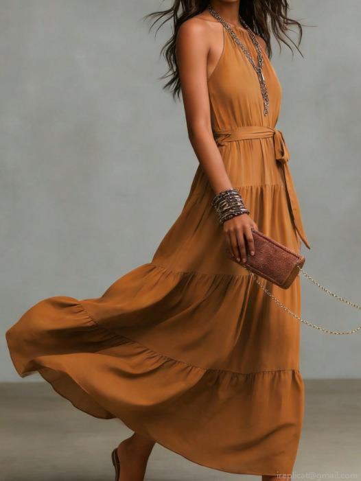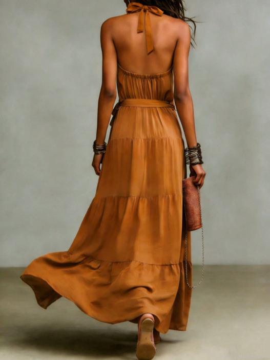 • Women's Bohemian Tiered Halter Maxi Dress Summer Solid Color Sleeveless Backless Chiffon Style Long Dress With Waist Tie For Beach Vacation Party