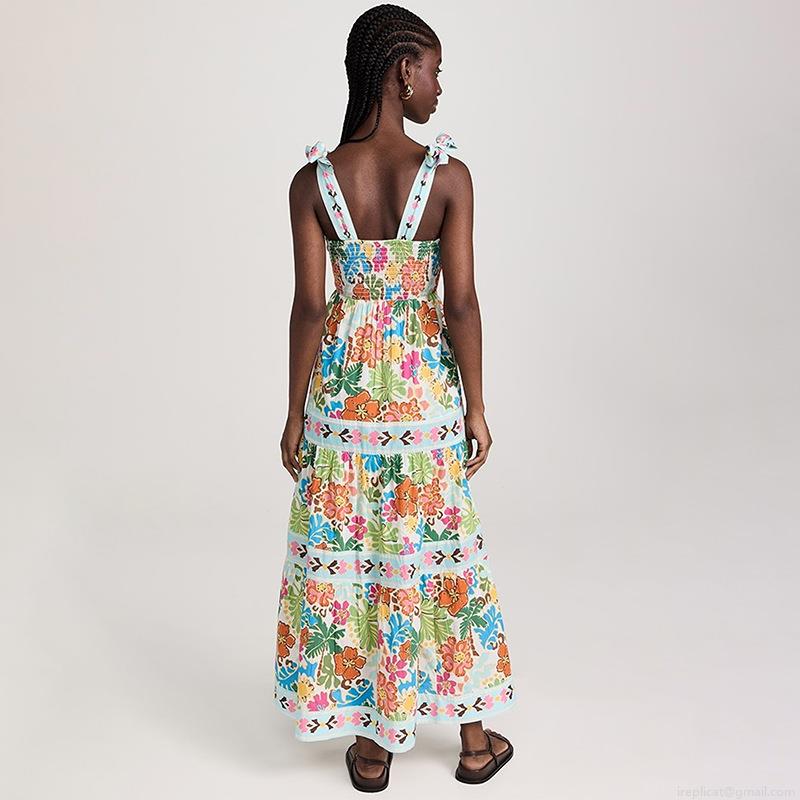Women's Bohemian Tropical Floral Print Maxi Dress Sleeveless Tiered Bow Strap High Waist Vacation Long Swing Dress