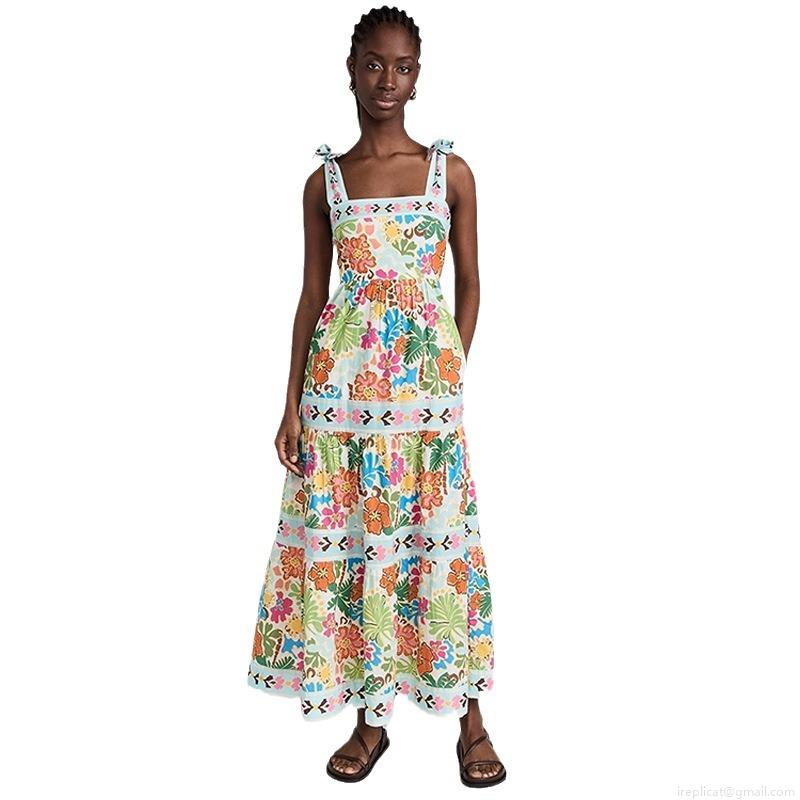 • Women's Bohemian Tropical Floral Print Maxi Dress Sleeveless Tiered Bow Strap High Waist Vacation Long Swing Dress