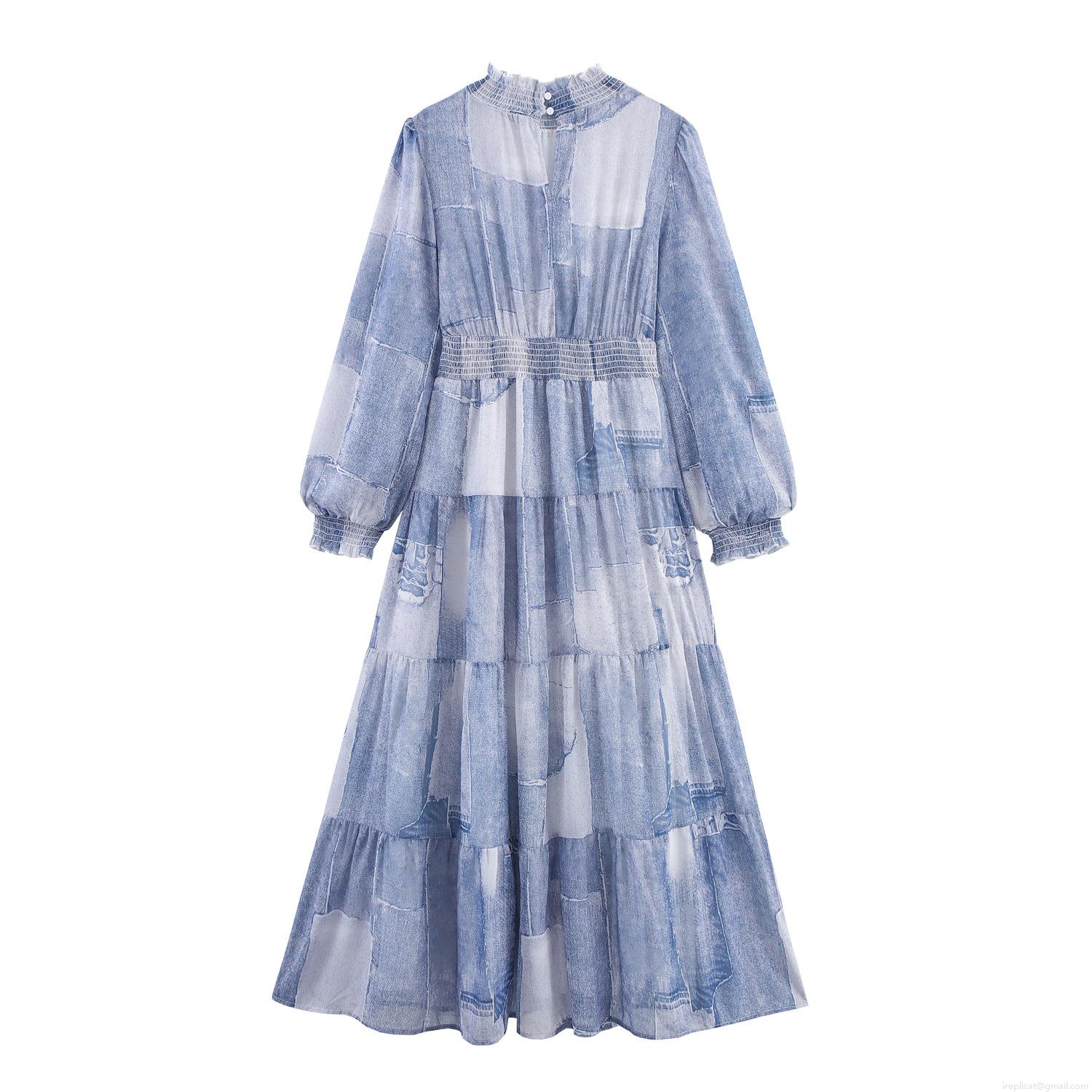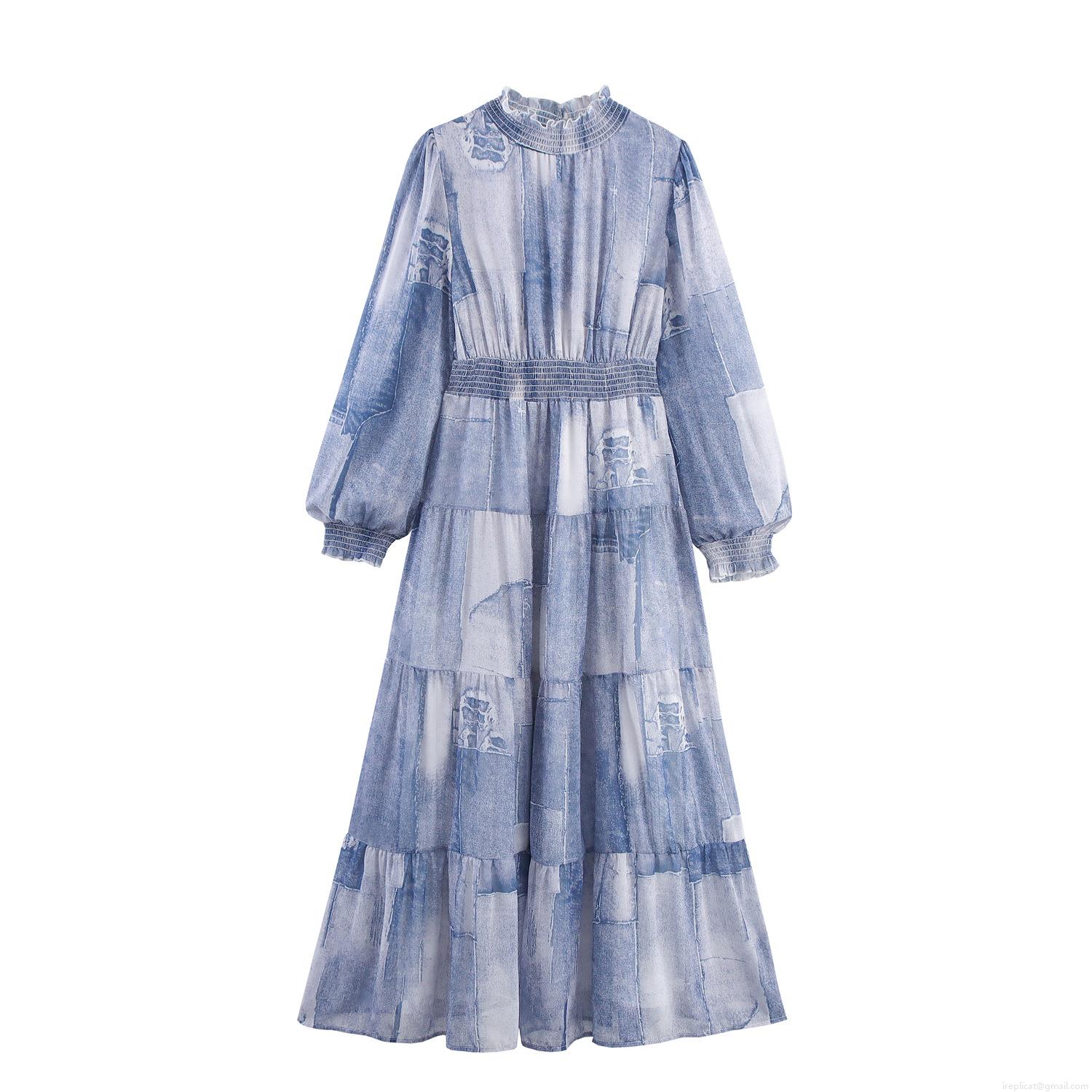 • Women's Boho Chiffon Maxi Dress Smocked Waist Long Sleeve Patchwork Tie Dye Tiered Cake Skirt Stand Collar Elegant Vacation Beach Holiday Long Gown