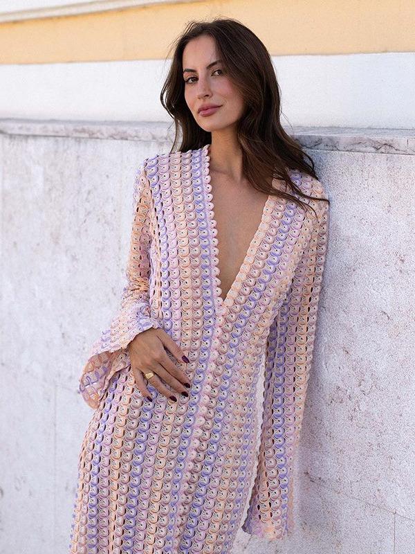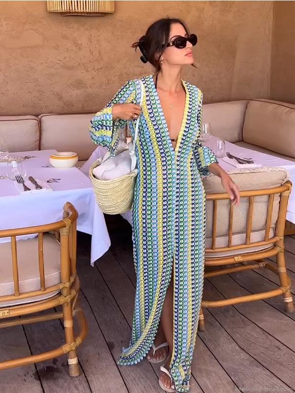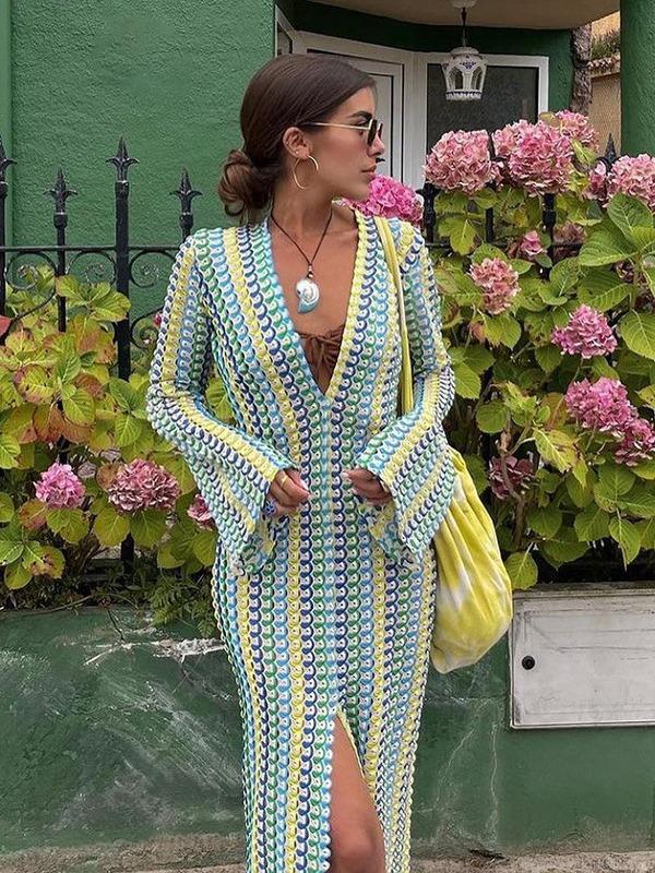 • Women's Boho Crochet Knit Maxi Dress Deep V-Neck Colorblock Long Sleeve Beach Vacation Floor-Length Sexy Geometric Pattern Bohemian Dress