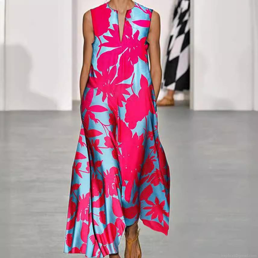 • Women's Boho Floral V-Neck Maxi Dress Sleeveless Summer Beach Vacation Loose Satin Print Long Dress For Ladies Elegant Party Wedding Guest