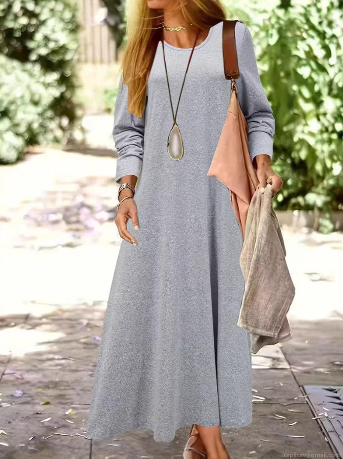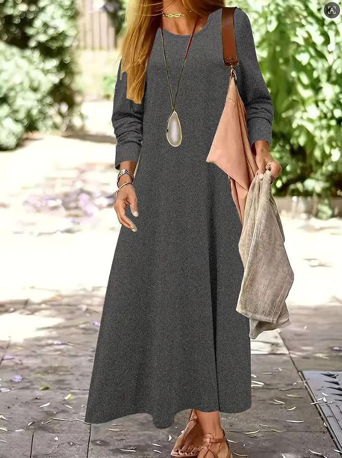 • Women's Casual Long Sleeve Maxi Dress Round Neck Loose Fit Solid Color Polyester Spandex Autumn Winter Long Gown For Women Daily Streetwear