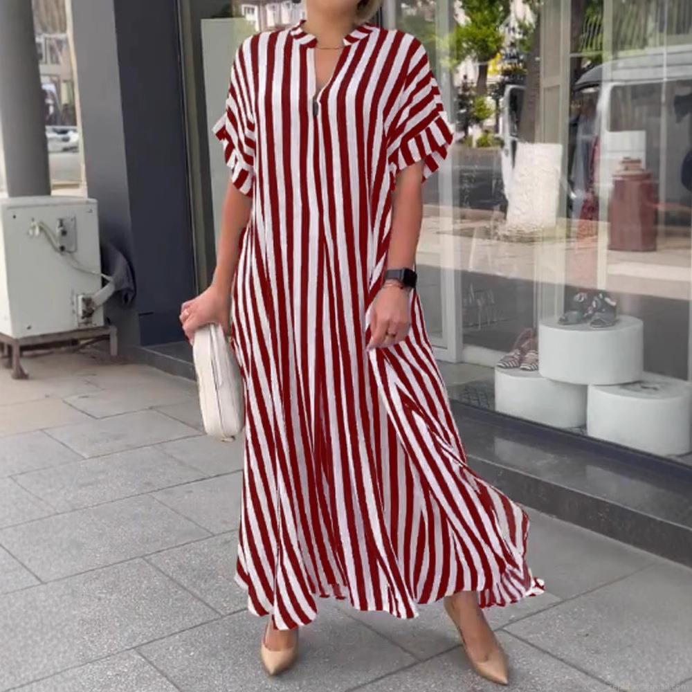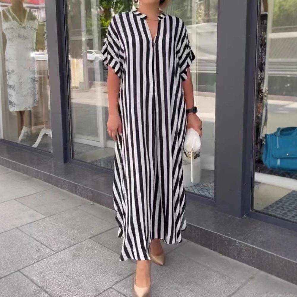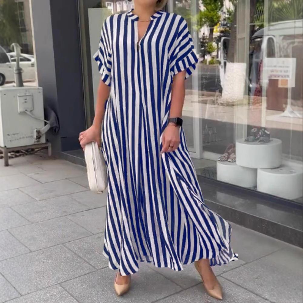 • Women's Casual Striped V-Neck Maxi Dress Short Sleeve Side Split Loose Summer Kaftan Dress Polyester Spandex Knit Long Dress