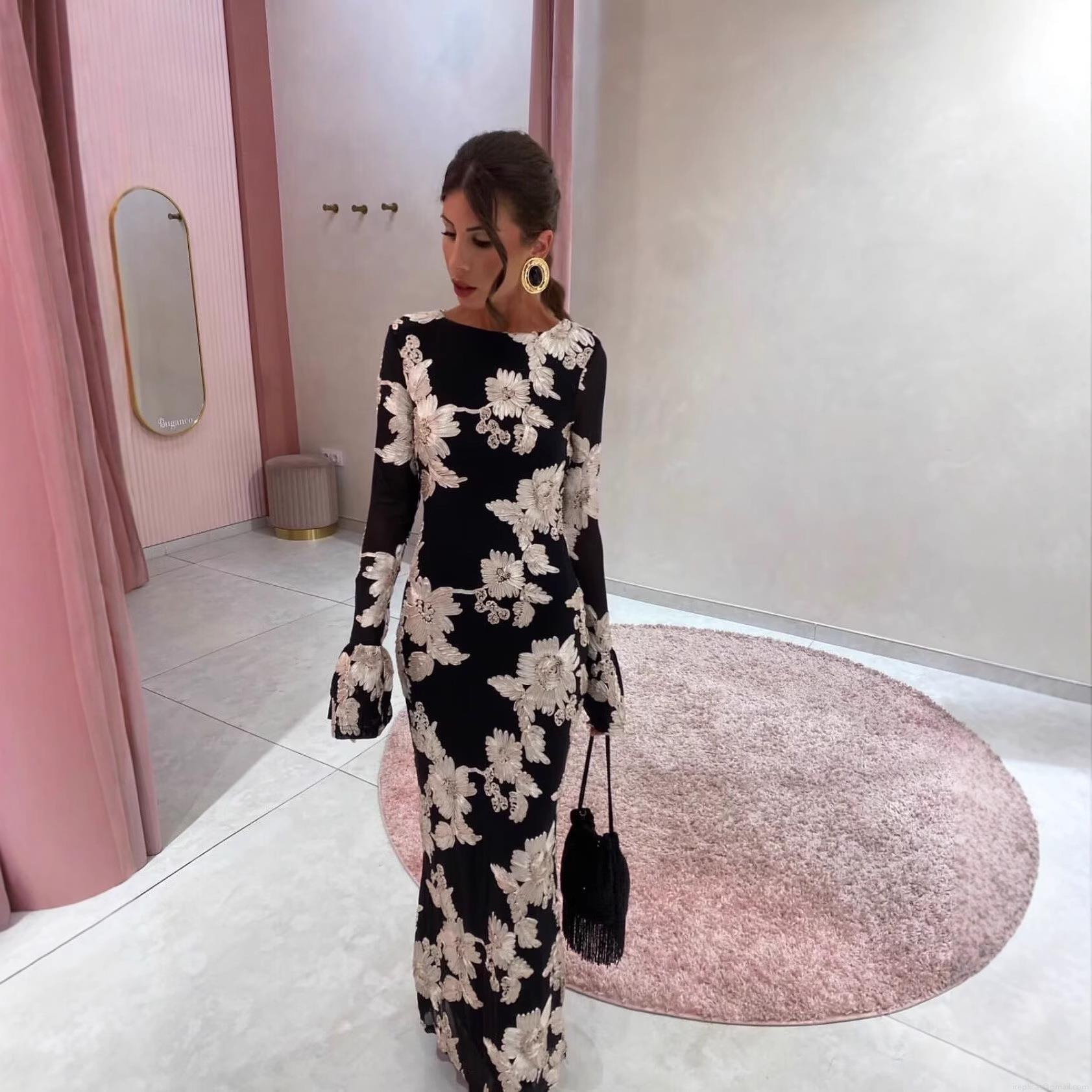 Women's Elegant 3D Flower Embroidery Maxi Dress Round Neck Bell Sleeve Bodycon Floor Length Mesh Polyester Slim Fit Evening Party Gown