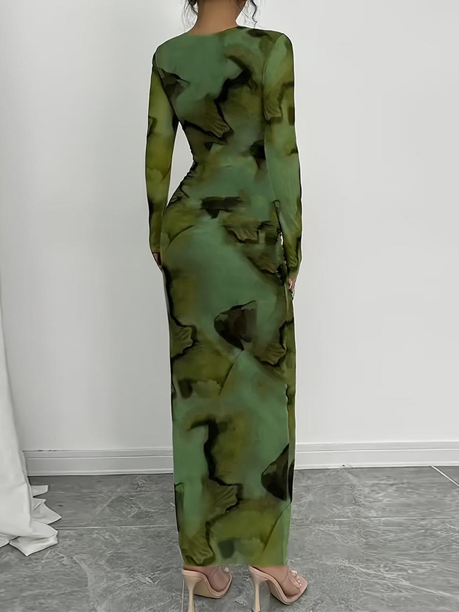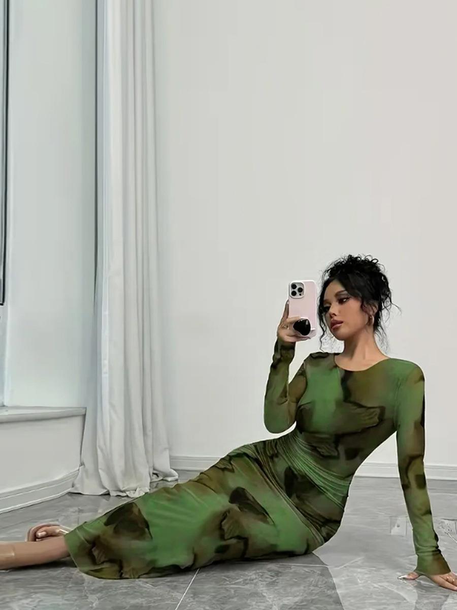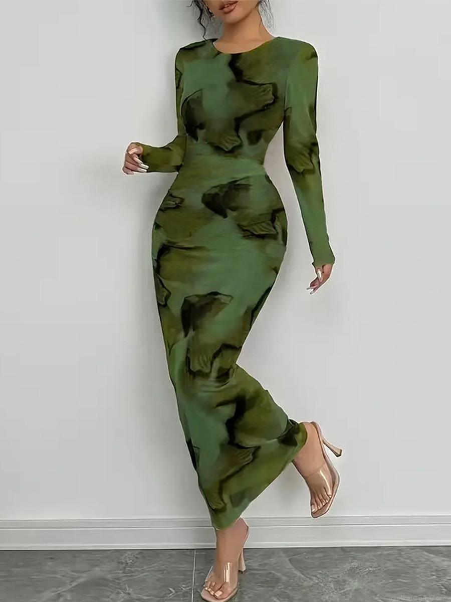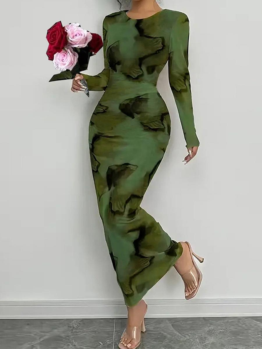 • Women's Elegant Abstract Marble Print Long Sleeve Maxi Dress Slim Fit High Stretch Milk Silk Bodycon Pencil Long Gown for Autumn Winter Commuting Party