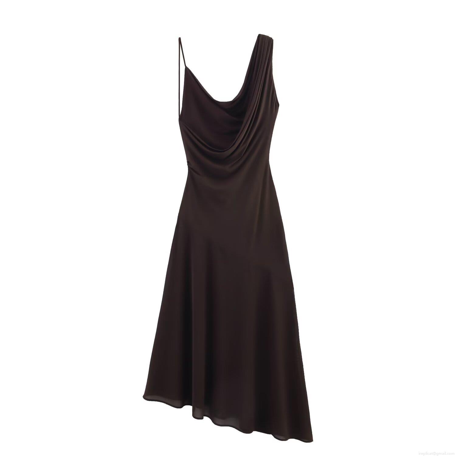 Solid Color, Thin Shoulder Straps, Dangling, Side Pleats, Asymmetrical Neckline
