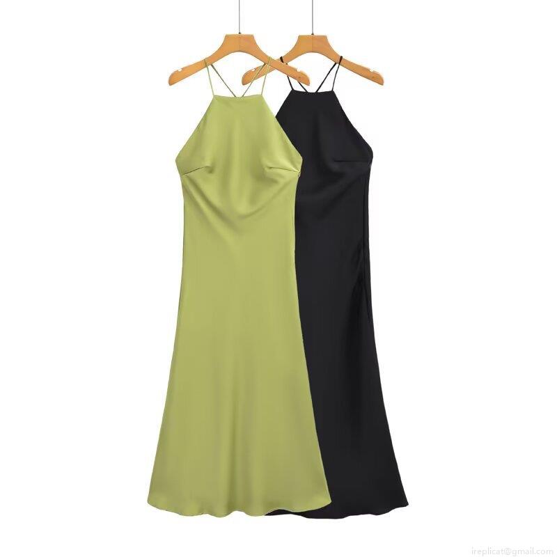 • Women's Elegant Backless Halter Satin Maxi Dress Slim Fit Cross Strap Evening Party Long Slip Dress Solid Color Polyester Dress