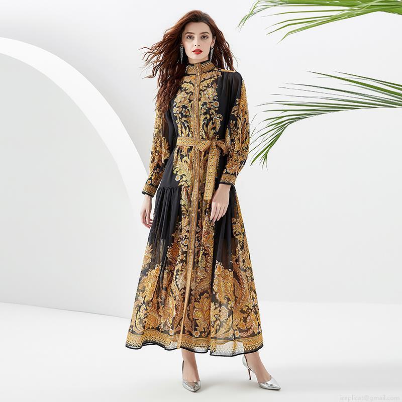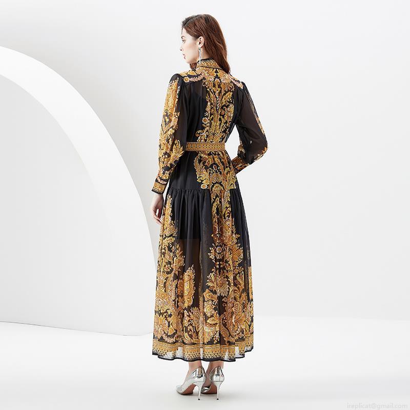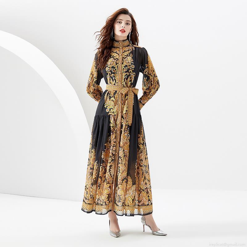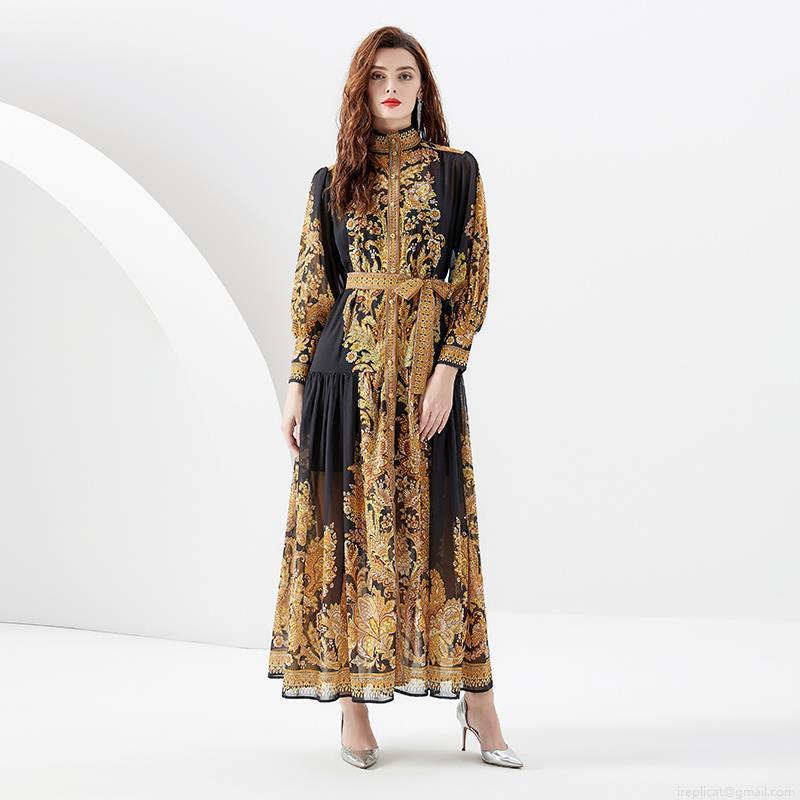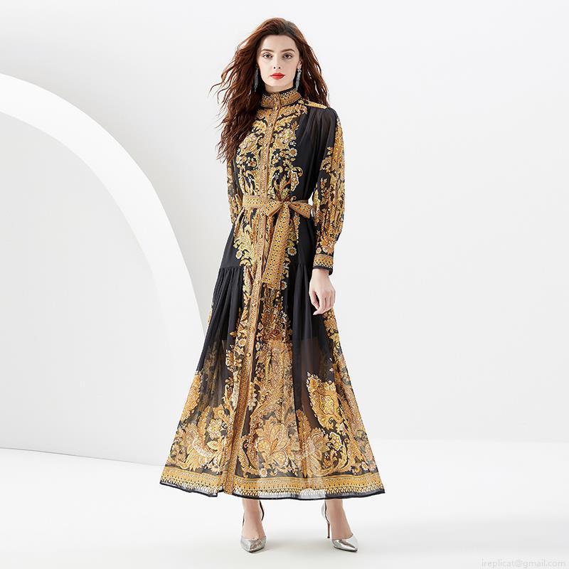 • Women's Elegant Baroque Gold Print Maxi Dress Vintage Palace Style Stand Collar Lantern Sleeve Long Dress With Belt For Vacation Party Evening