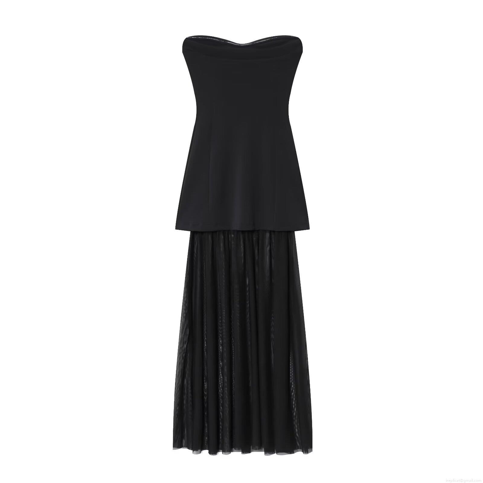 Women's Elegant Black Tube Top Patchwork Maxi Dress Sweetheart Neckline Mesh Spliced Long Dress For Party Evening Formal Event Clubwear