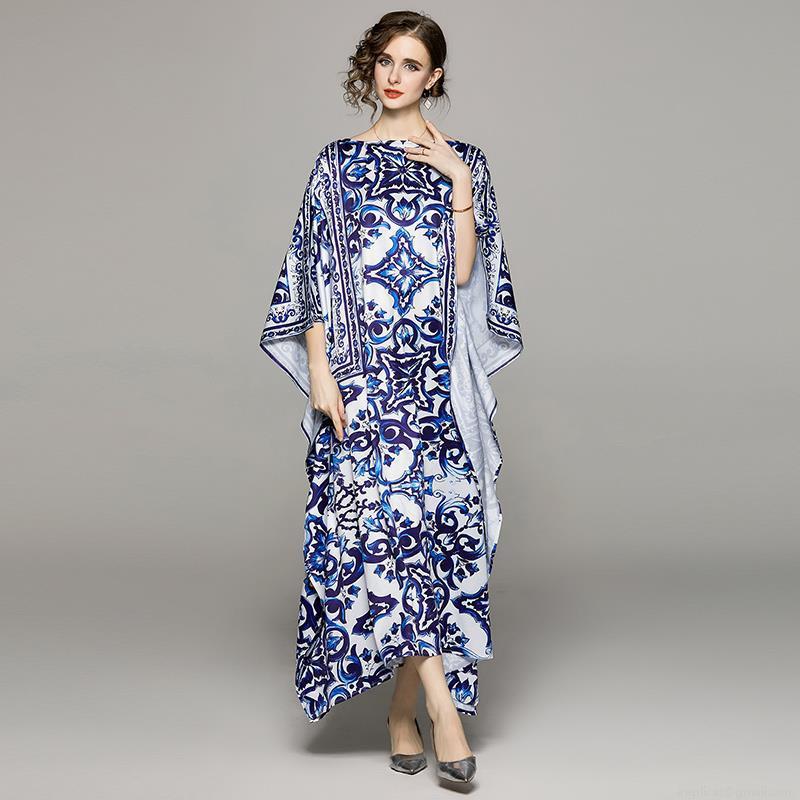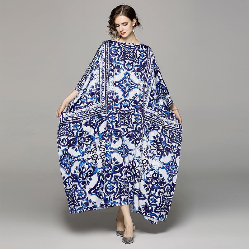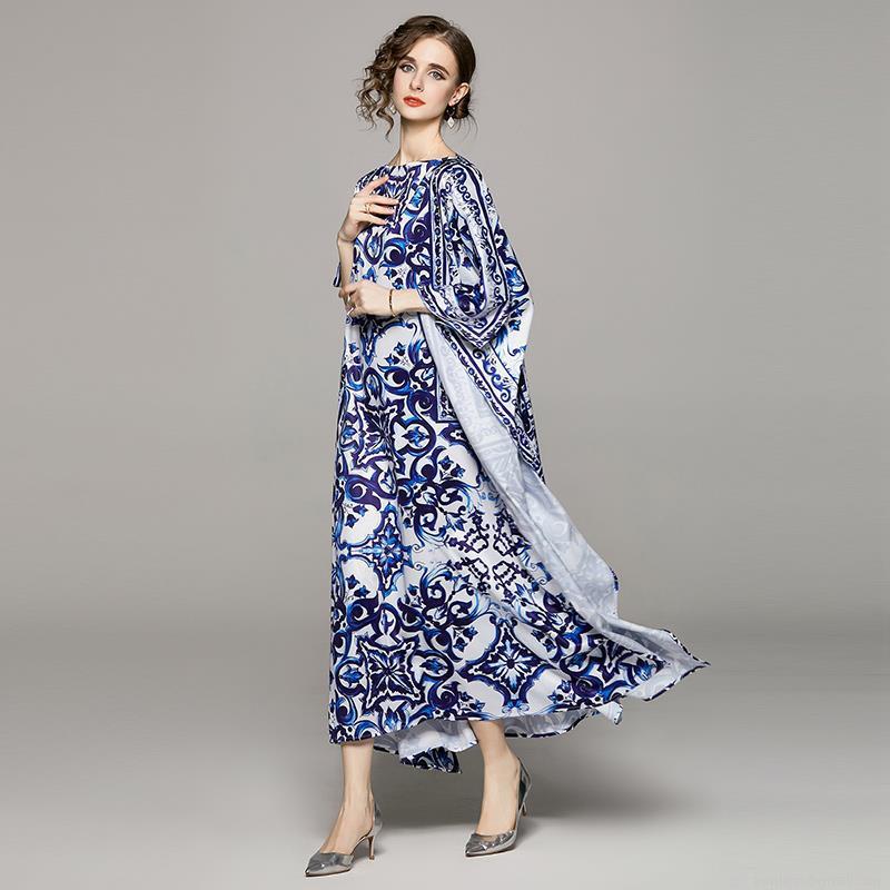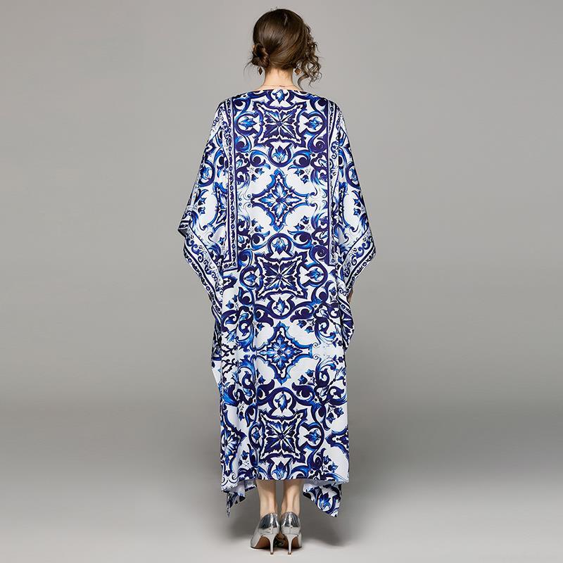 • Women's Elegant Blue and White Porcelain Print Maxi Dress Polyester Off-Shoulder Batwing Sleeve Loose Kaftan Gown For Vacation Beach Party Summer Spring Resort Wear