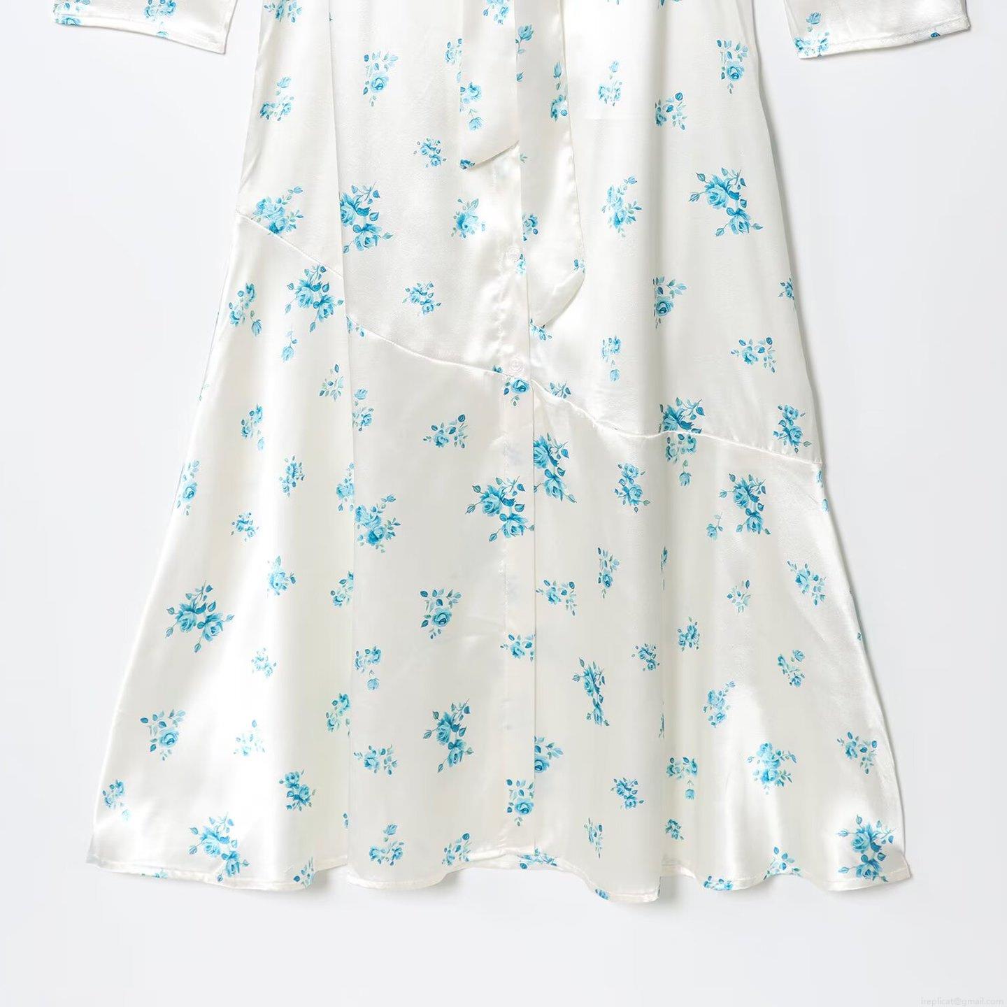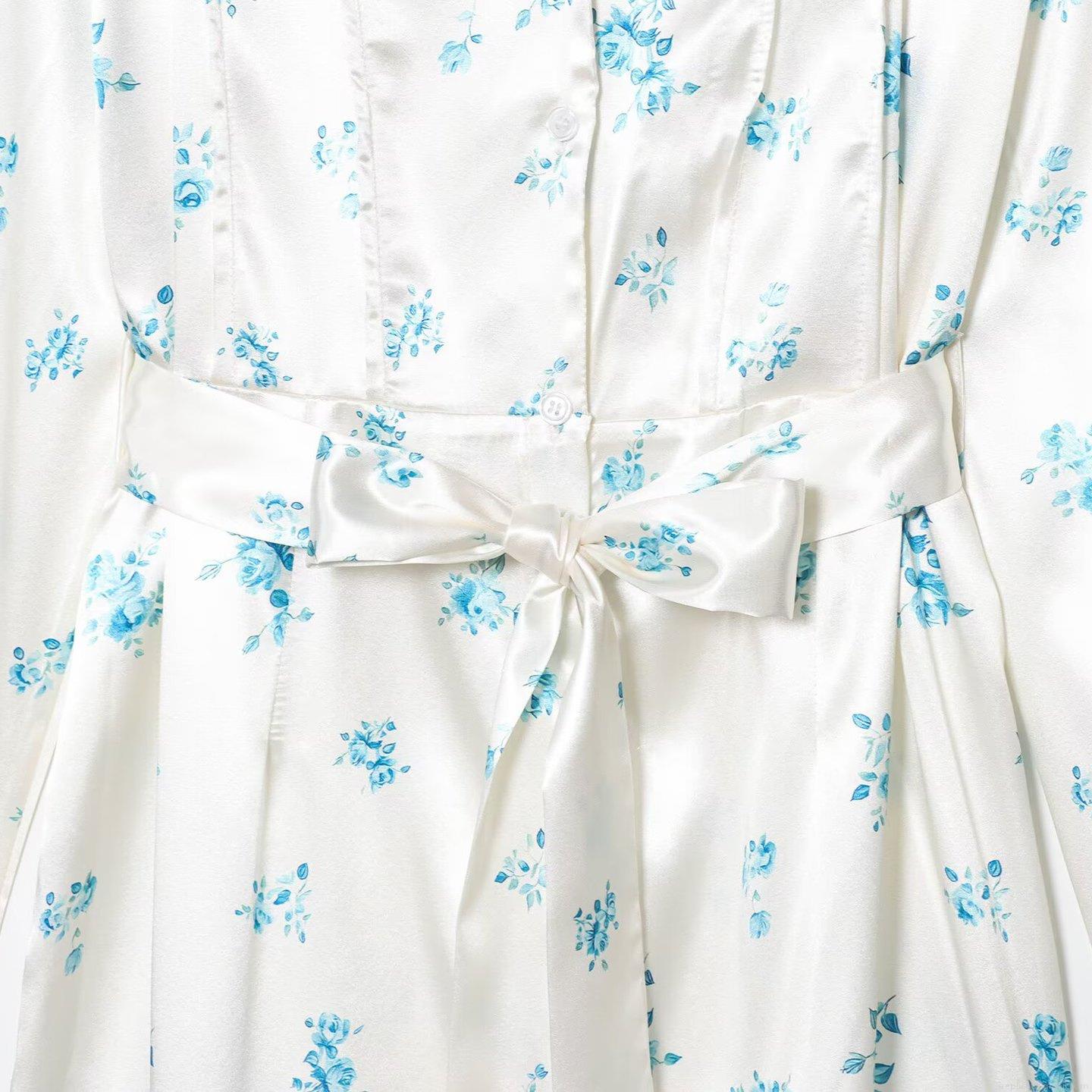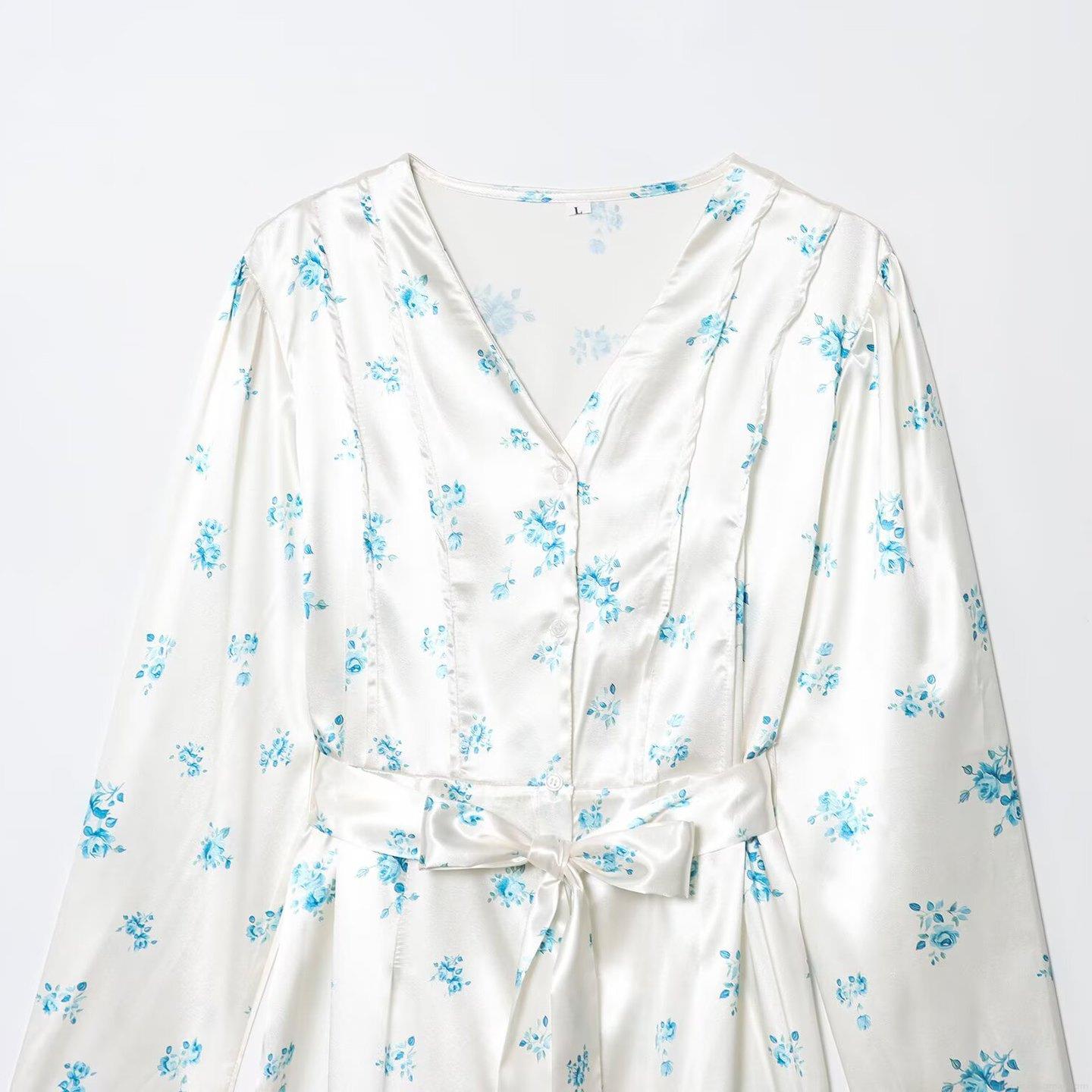 • Women's Elegant Blue Floral Print Satin Maxi Dress Long Sleeve V-Neck Tie Waist A-Line Long Dress For Party Dating Office
