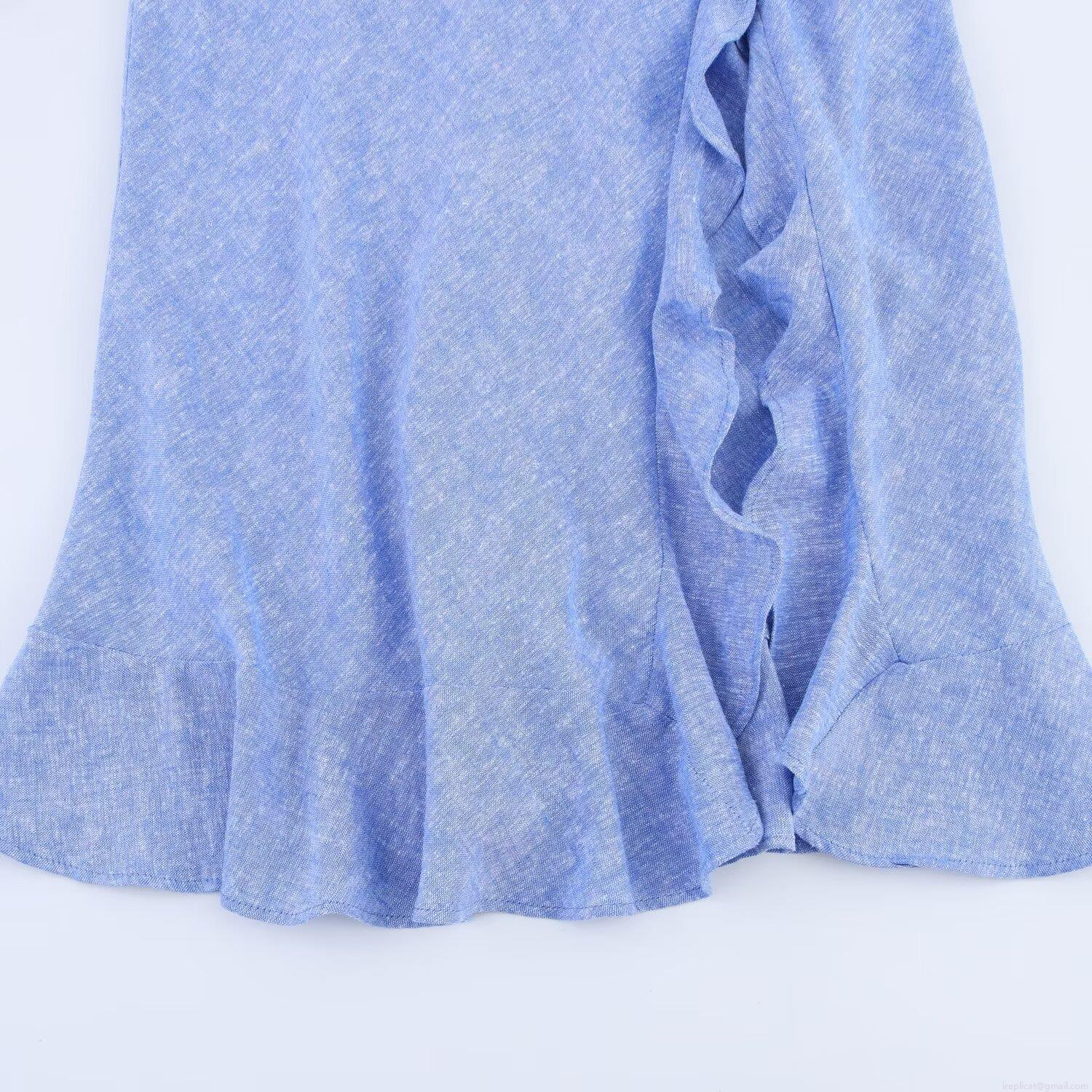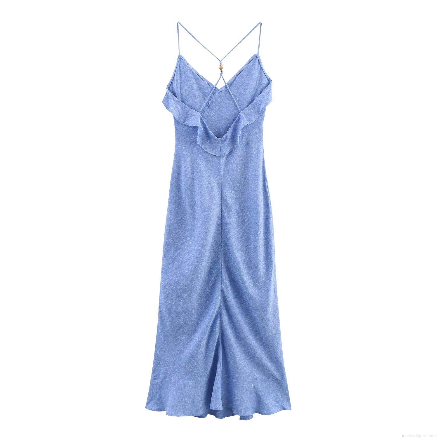 • Women's Elegant Blue V-Neck Maxi Dress With Wood Bead Straps Ruffles Criss Cross Backless High Slit Polyester Linen Look Party Vacation Dress