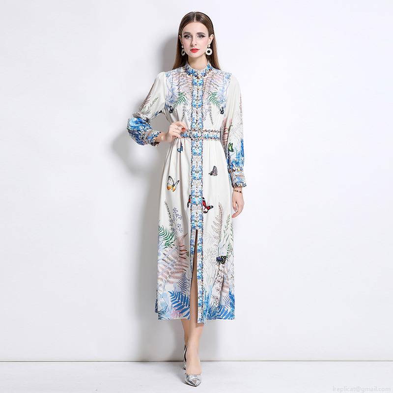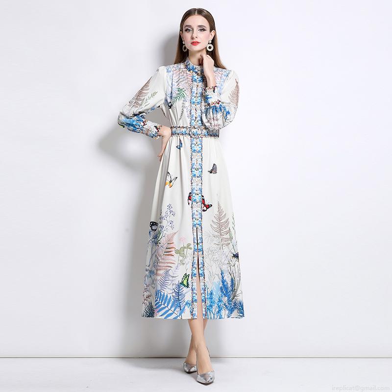 • Women's Elegant Butterfly Floral Print Long Sleeve Maxi Dress Stand Collar Single Breasted Polyester Blend Retro Court Style Party Dress With Belt
