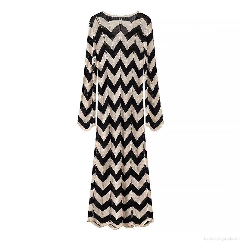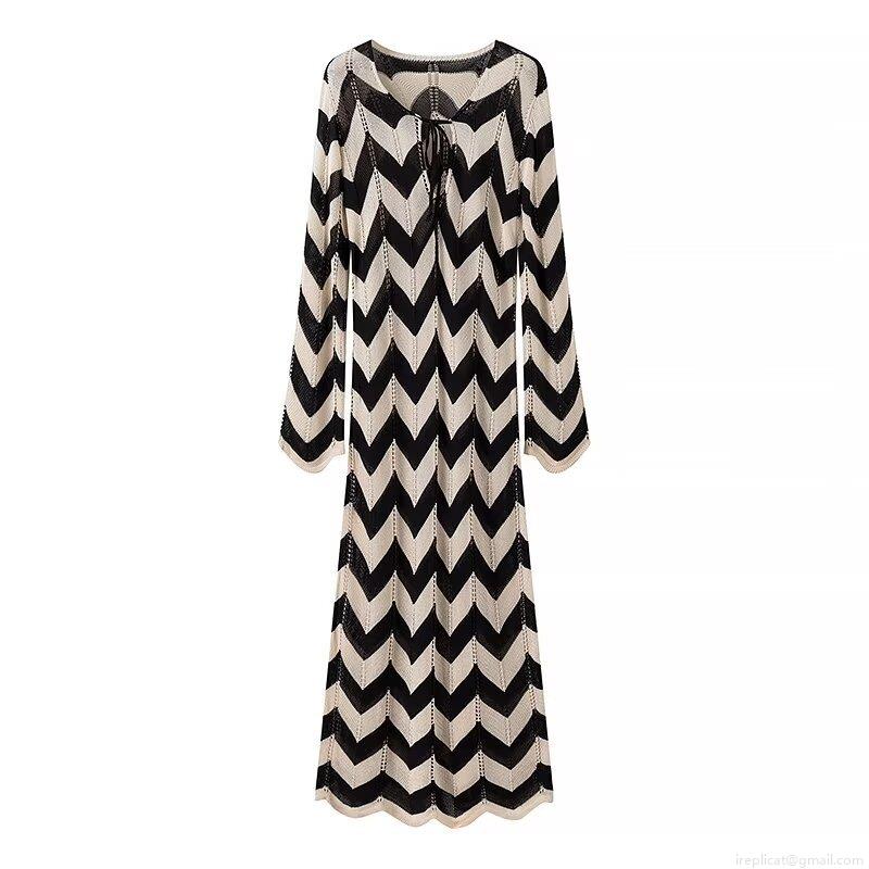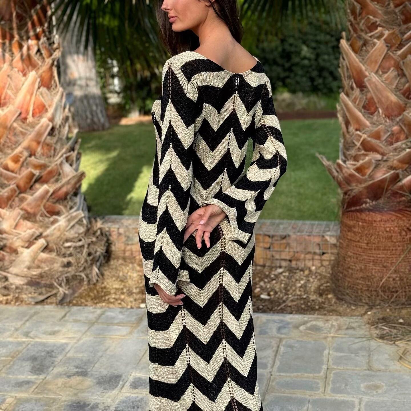 • Women's Elegant Chevron Wave Knit Maxi Dress V-Neck with Tie Long Sleeve Sleeveless Slim Fit Polyester Knitted Dresses for Summer Vacation Party
