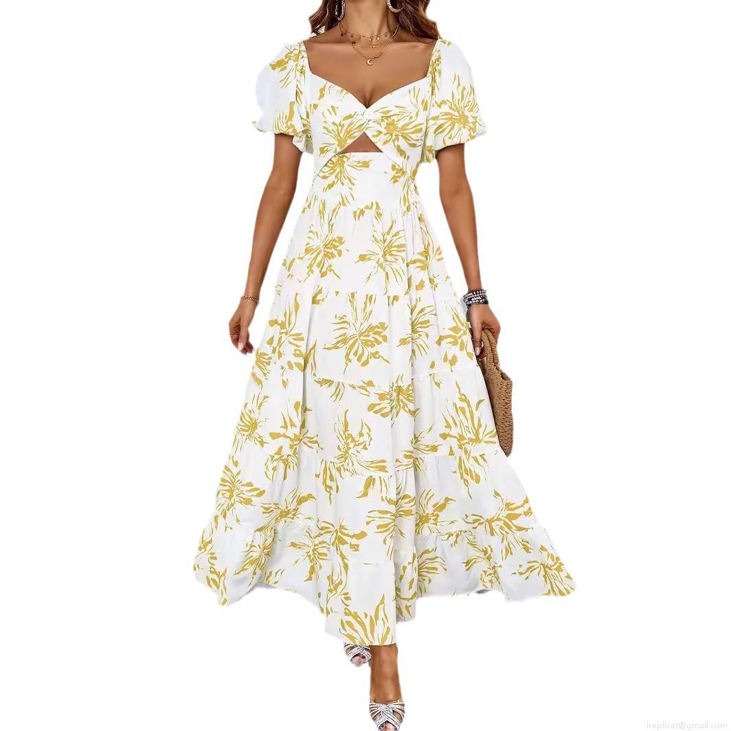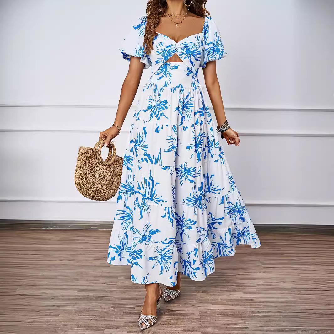 • Women's Elegant Floral Print Maxi Dress 100% Polyester Puff Sleeve Cut Out Waist Tiered A-Line Summer Vacation Bohemian Long Dress