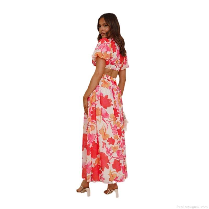 • Women's Elegant Floral Print Maxi Dress 100% Polyester V-Neck Puff Sleeve Backless Cut-out Vacation Summer A-Line Beach Long Dress