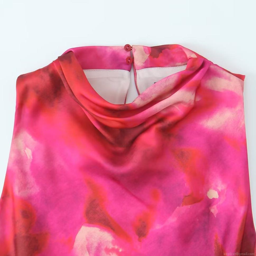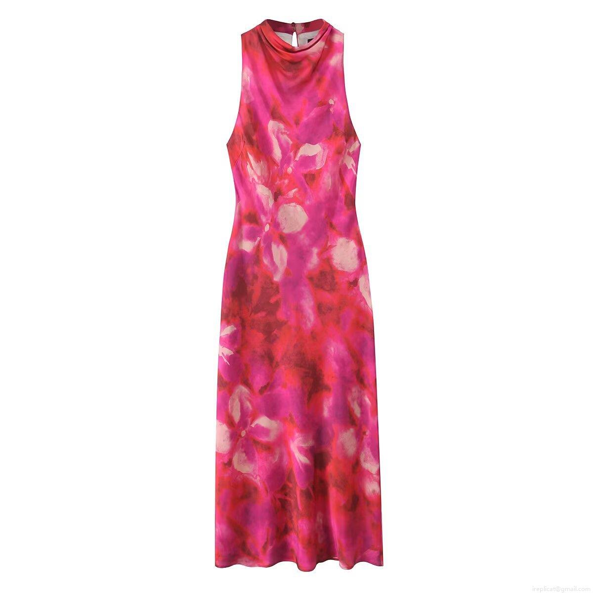 • Women's Elegant Floral Print Satin Maxi Dress Sleeveless High Neck Stacked Collar A-Line Long Dress For Summer Party Date Night Lady