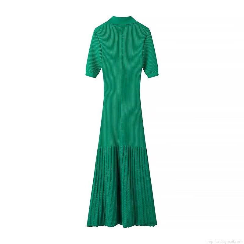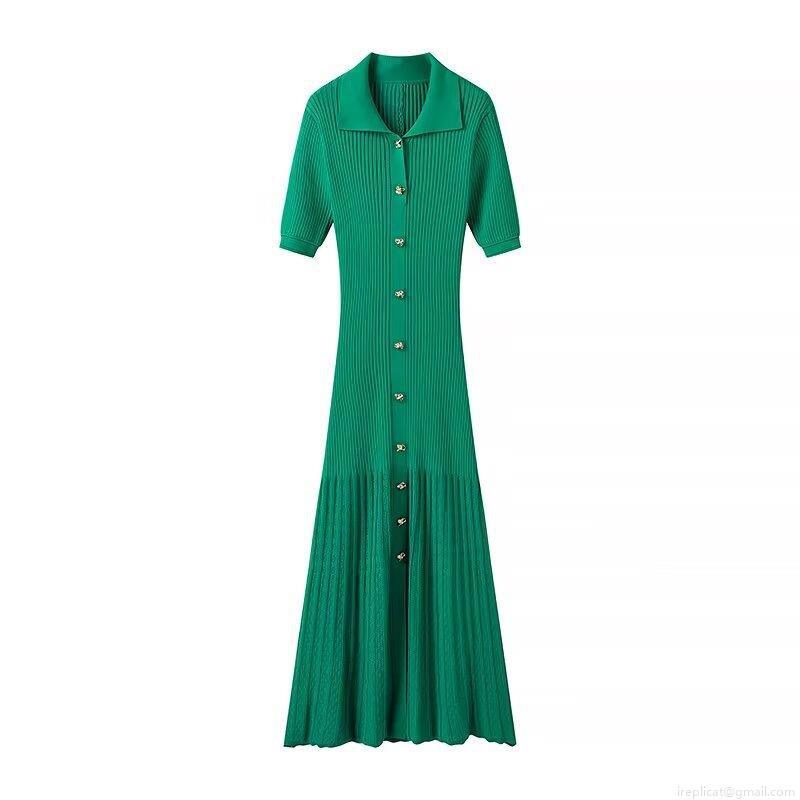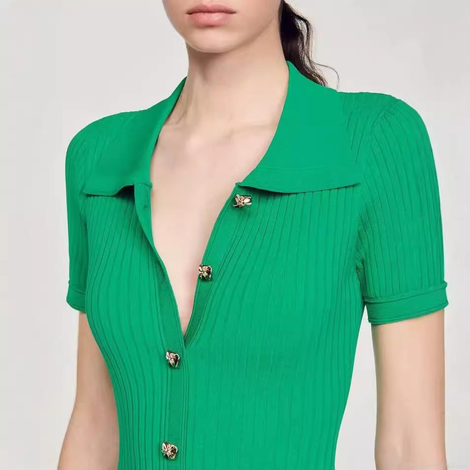 Solid Color, Polo Collar, Ribbed Texture, Gold Buttons, Pleated Skirt