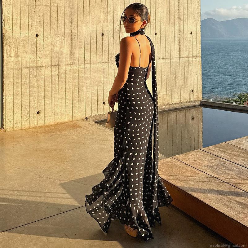 • Women's Elegant French Polka Dot Maxi Dress With Matching Scarf Halter Backless Ruffle Fish-Tail Evening Party Long Dress For Vacation