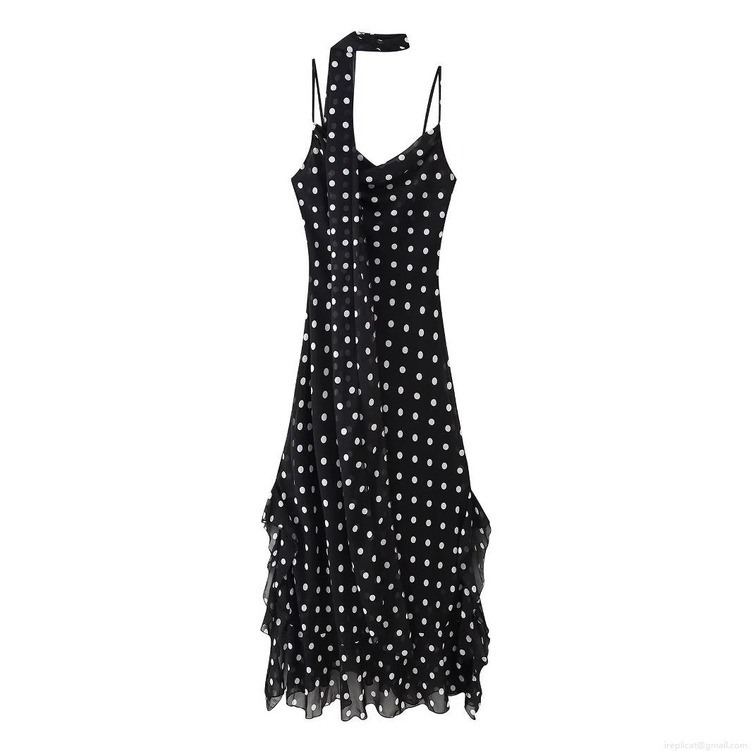 Women's Elegant French Polka Dot Maxi Dress With Matching Scarf Halter Backless Ruffle Fish-Tail Evening Party Long Dress For Vacation