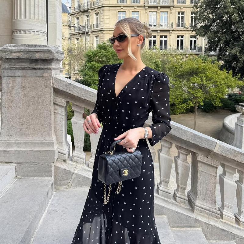 • Women's Elegant French Style Polka Dot Maxi Dress V-Neck Long Sleeve High Slit Waist Tie Chiffon Polyester Blend Long Dress For Party Vacation Daily Wear