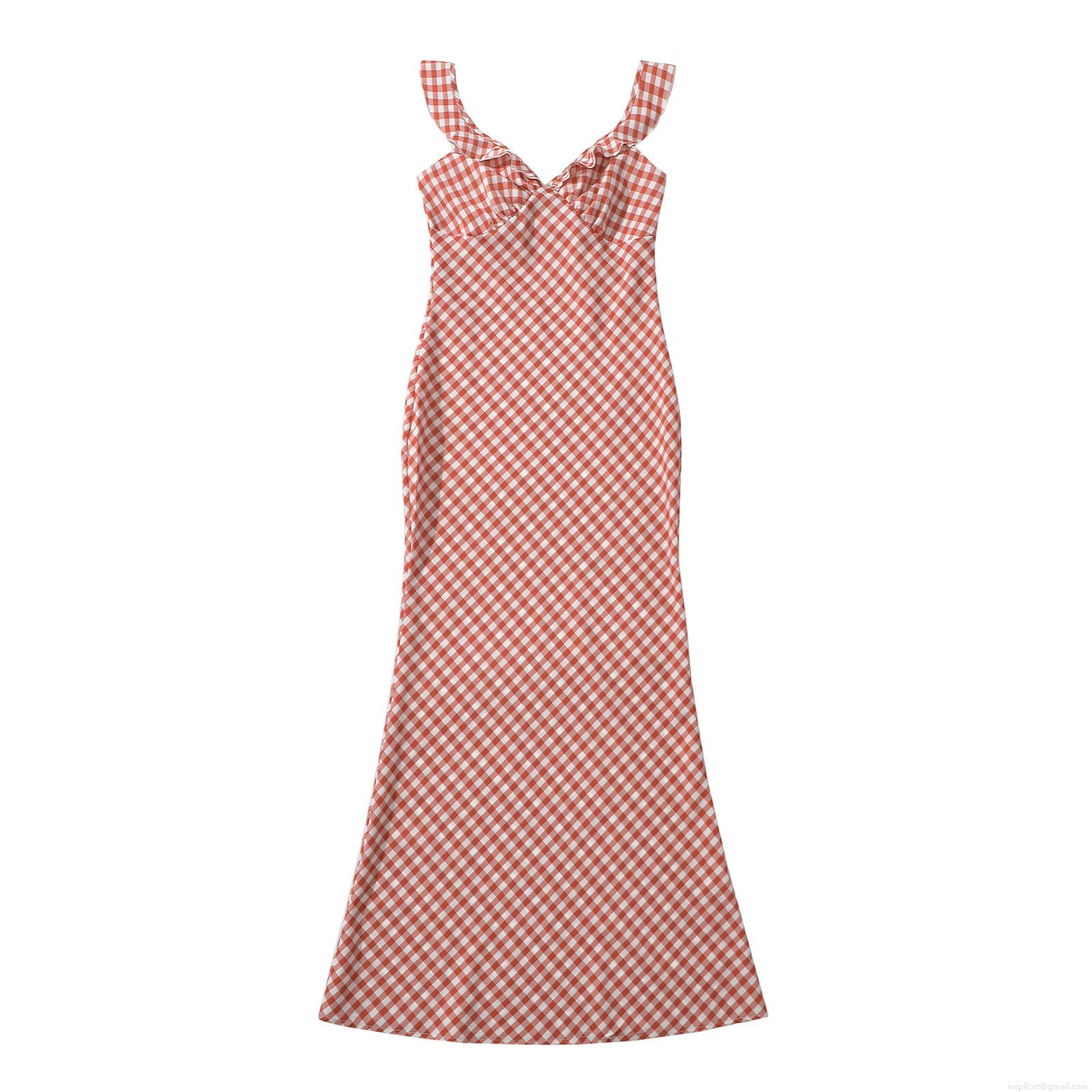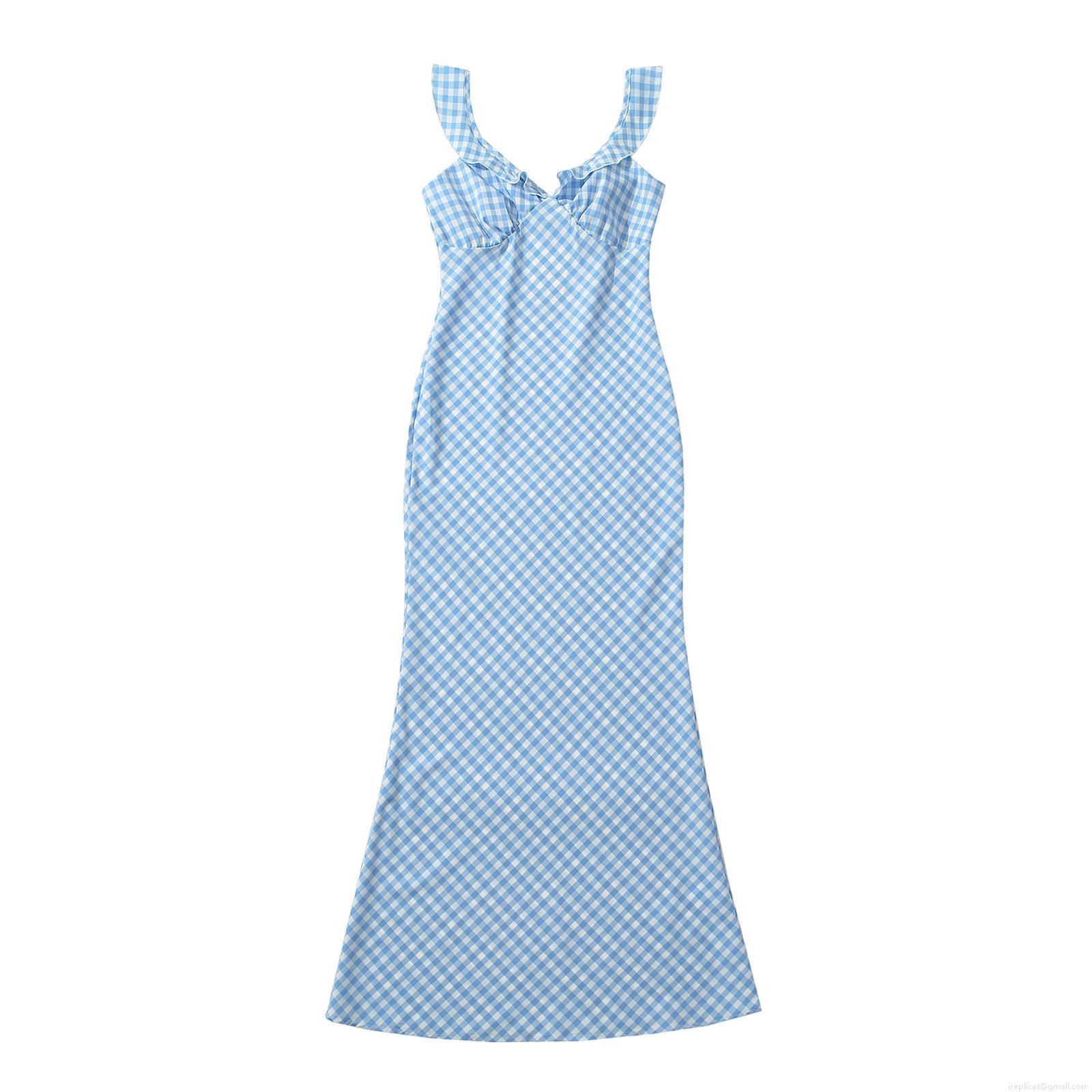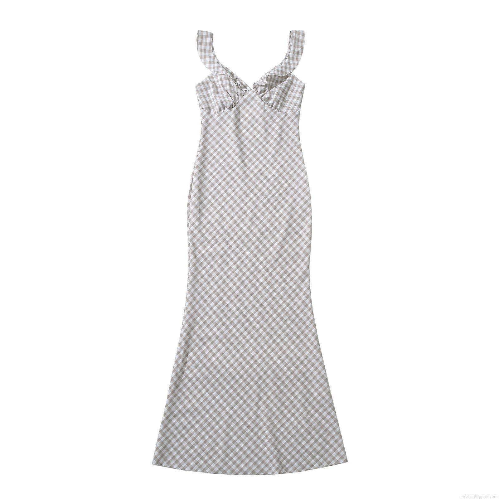 • Women's Elegant Gingham Plaid Spaghetti Strap Maxi Dress V-Neck Ruffle Bodycon Fish Tail Long Sundress for Summer Vacation Party Clubwear