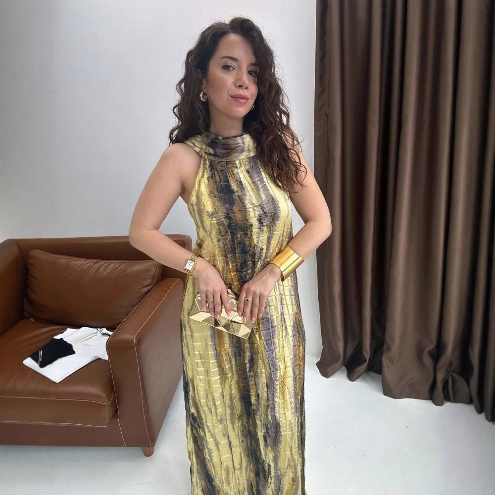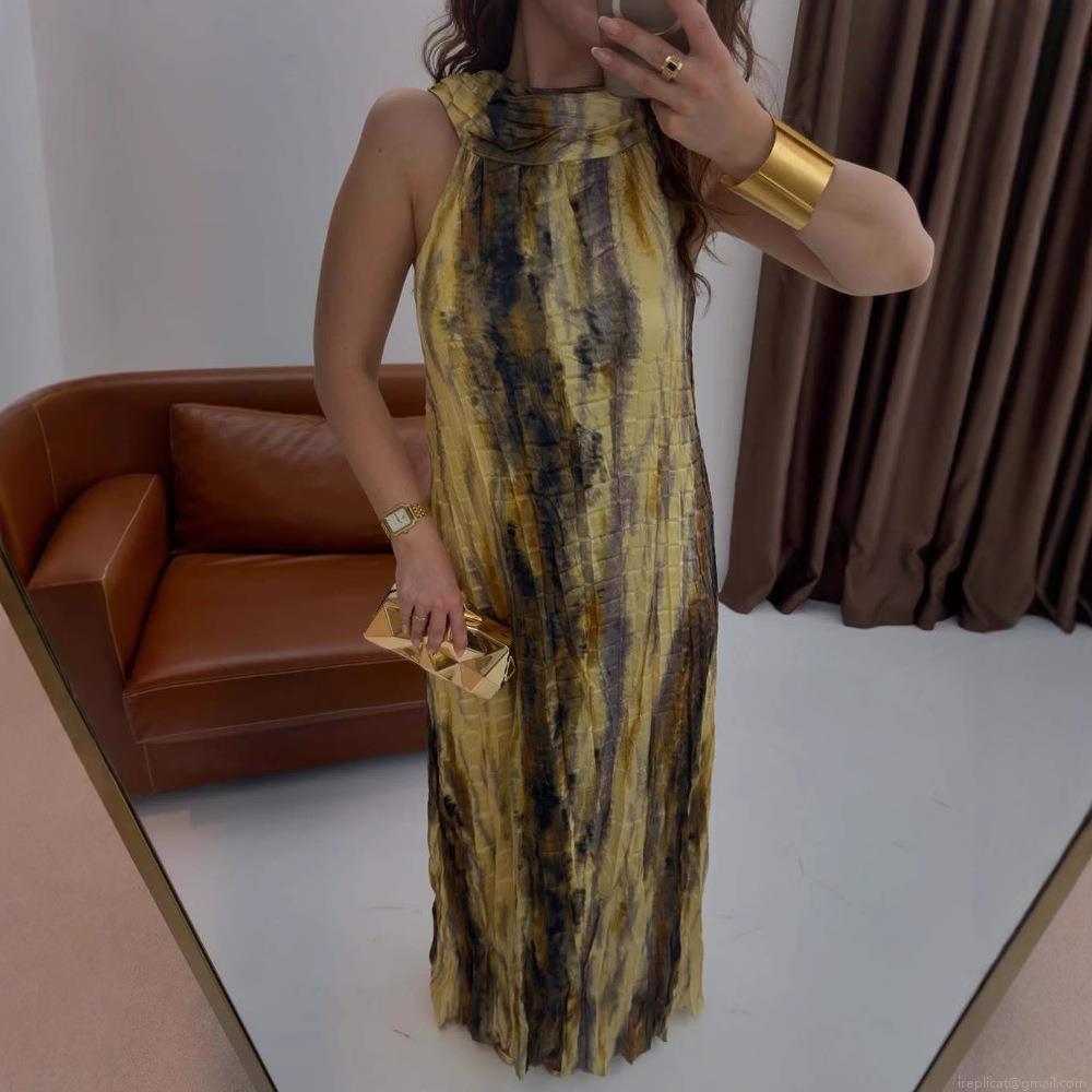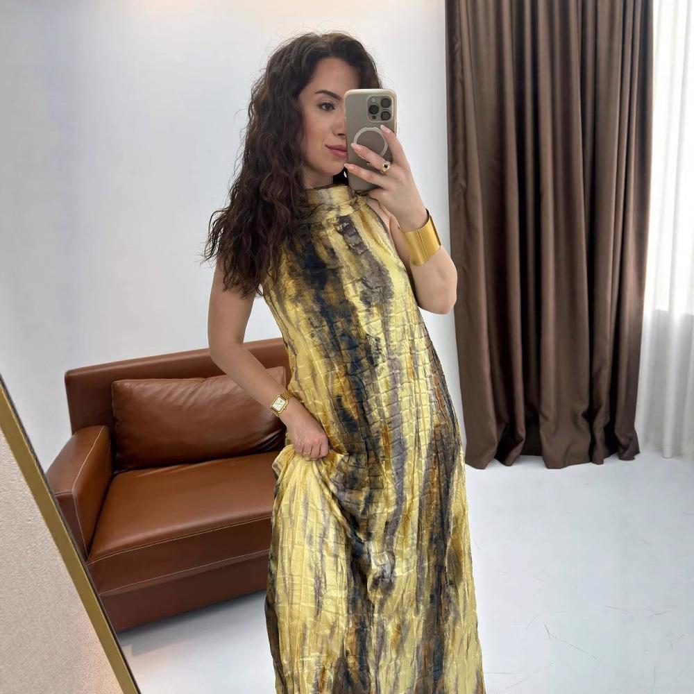 Women's Elegant Gold Marble Print Pleated Maxi Dress Halter Neck Sleeveless Slim Fit Party Evening Gown