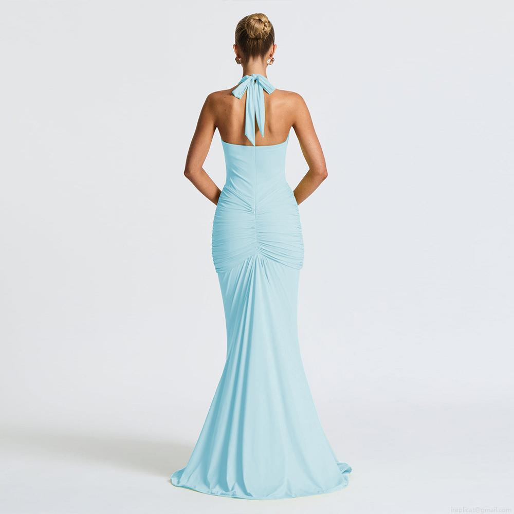 Women's Elegant Halter Deep V Neck Ruched Backless Mermaid Maxi Dress Sexy Sleeveless Polyester Milk Silk Long Wedding Party Evening Gown