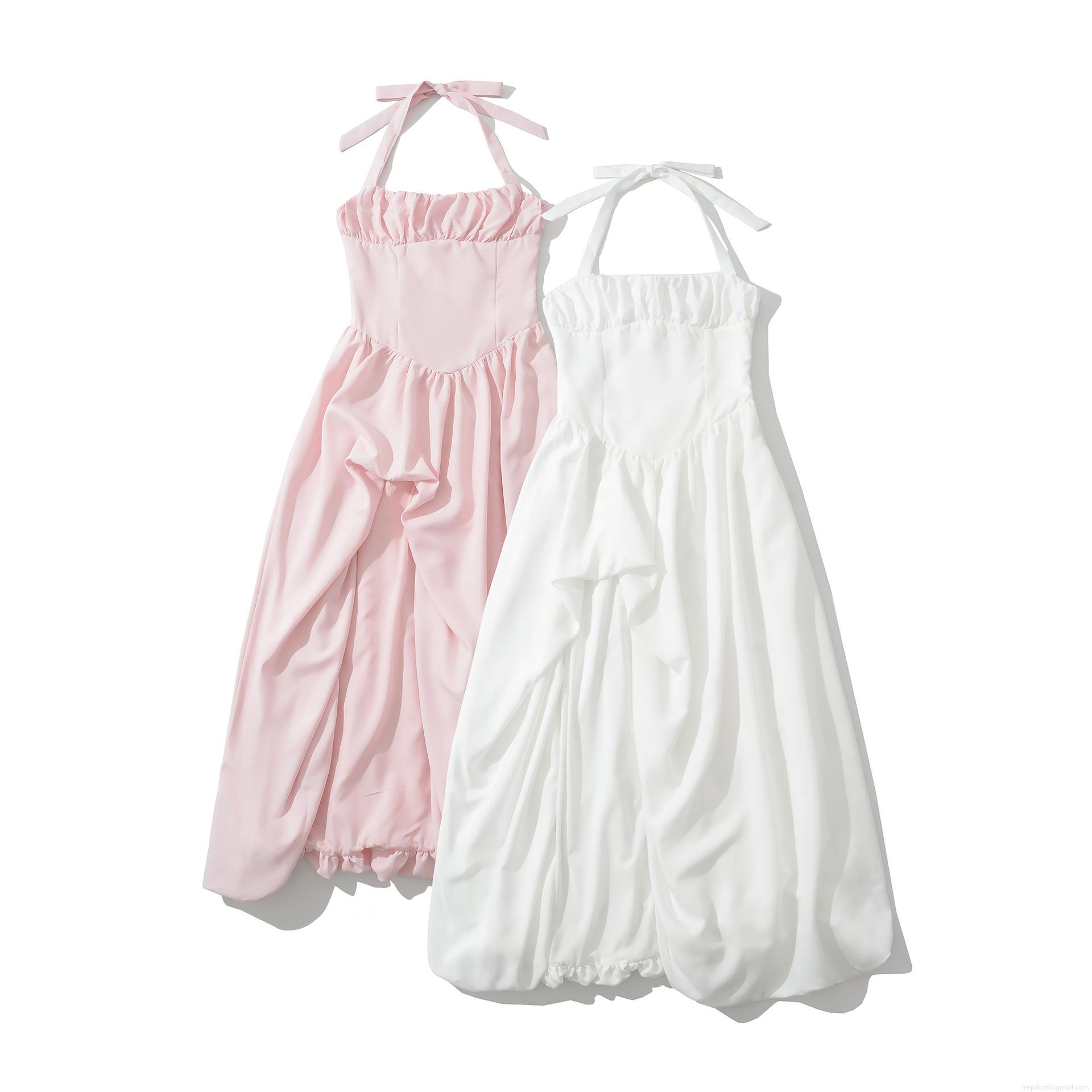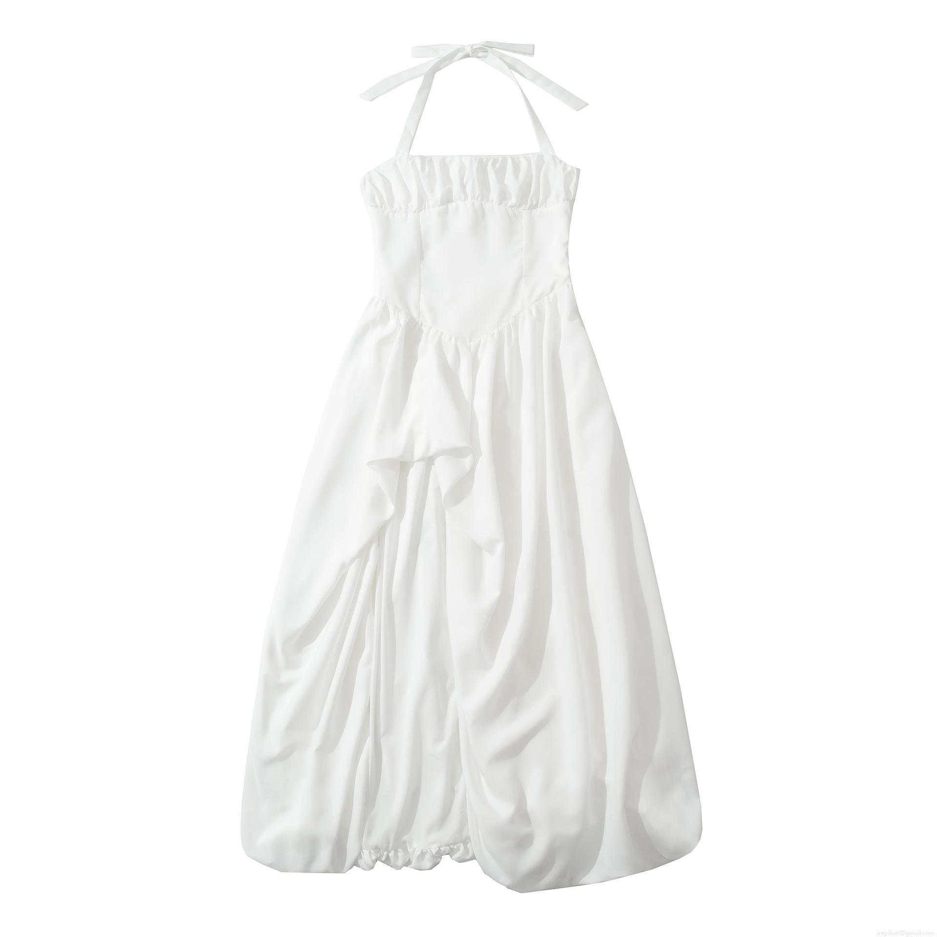 Solid Color, Backless, Halter Neck Strap, Bubble Skirt, Wrinkled Chest