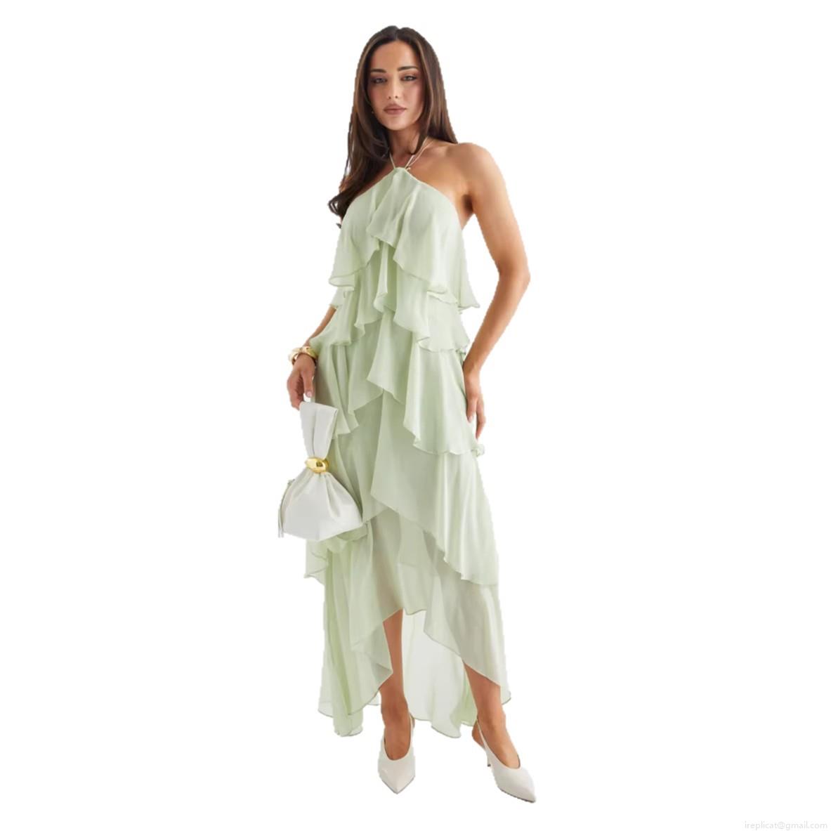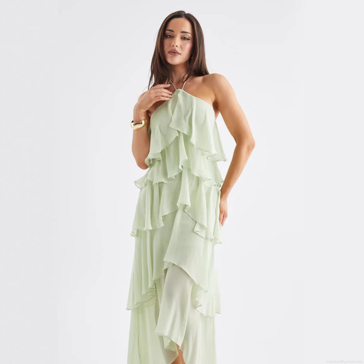 • Women's Elegant Halter Neck Layered Ruffle Maxi Dress Sexy Backless Chiffon Tiered Cake Dress For Summer Vacation Party Evening Wear