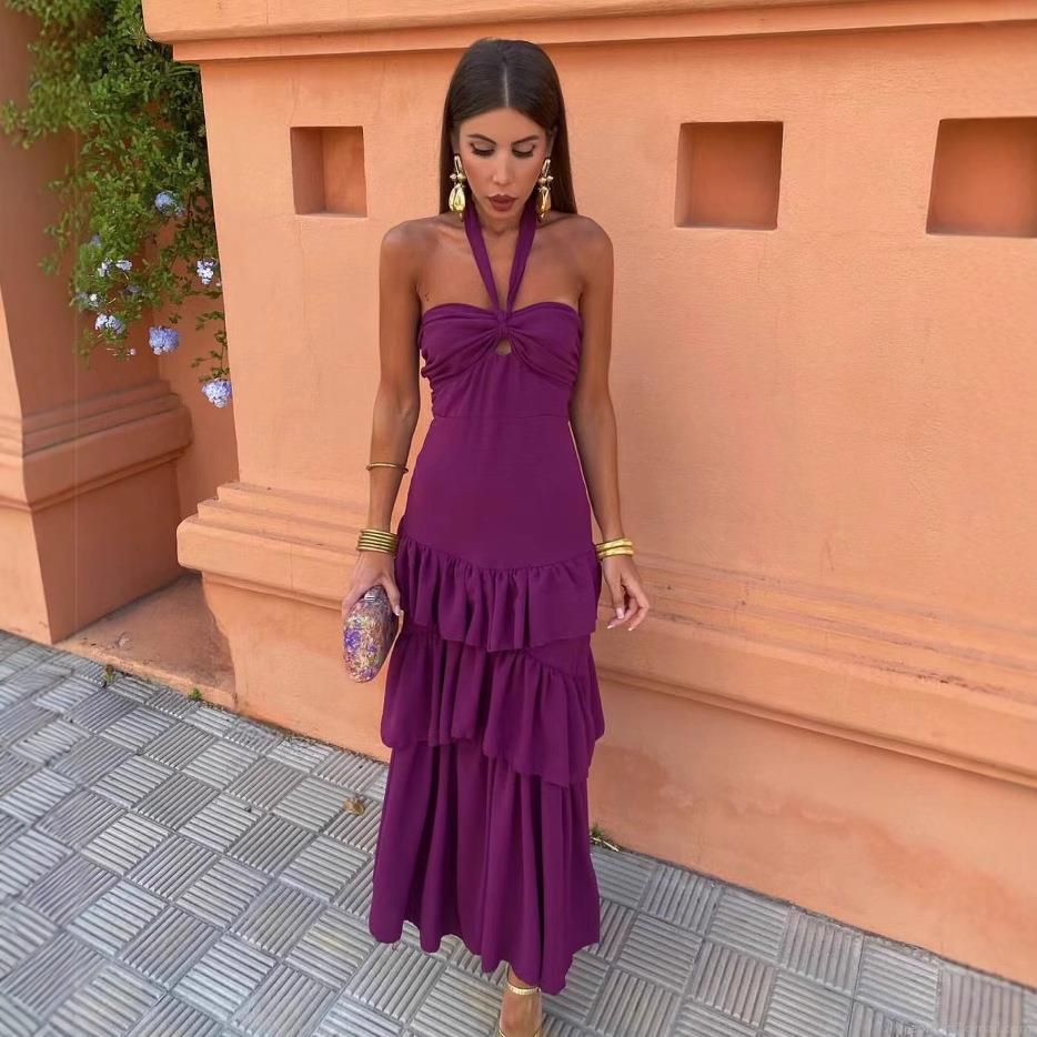 • Women's Elegant Halter Neck Maxi Dress Sexy Backless Tiered Ruffle Polyester Sleeveless Cutout Twist Front Long Dress For Evening Party Wedding Vacation