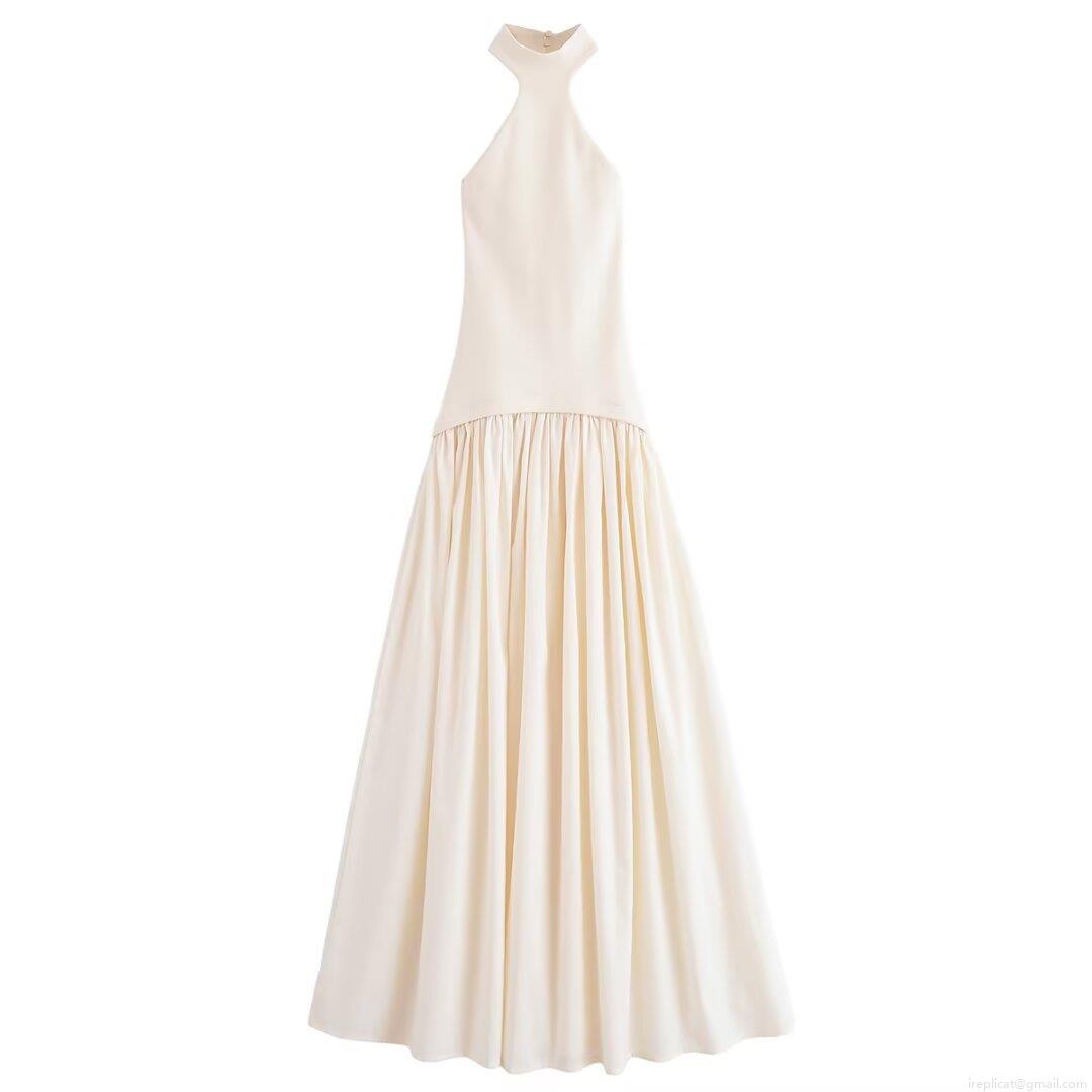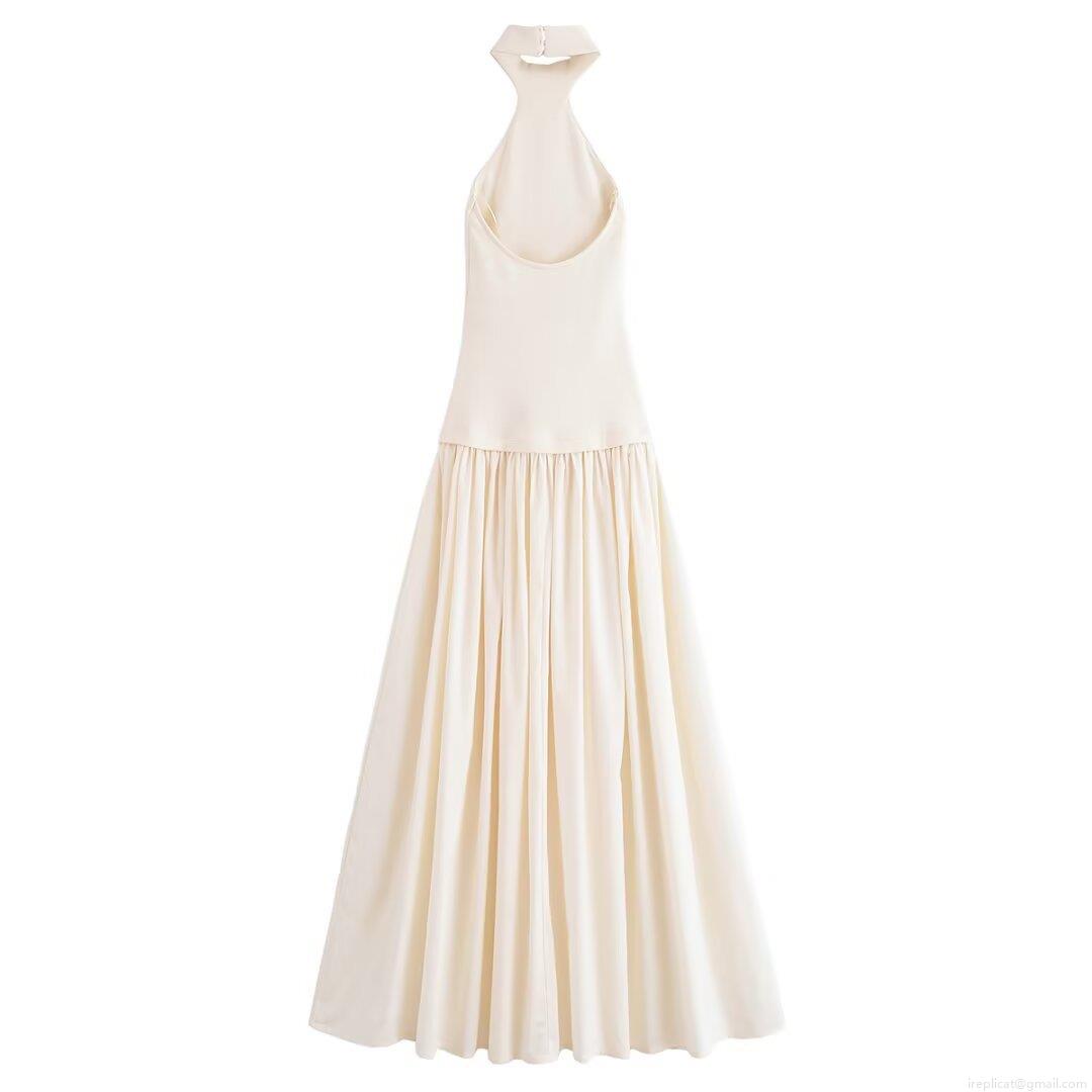Women's Elegant Halter Neck Pleated Maxi Dress Ivory Patchwork Rib Knit Sleeveless Backless Long Dress For Party Vacation