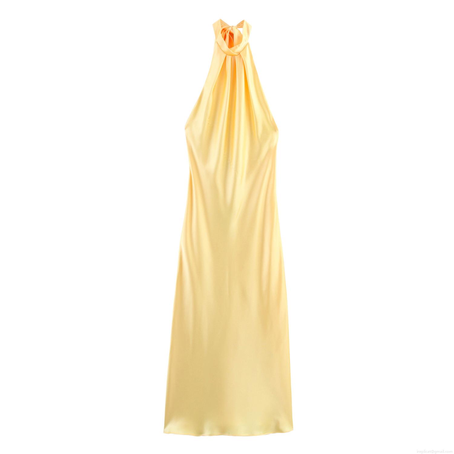 • Women's Elegant Halter Neck Satin Maxi Dress Backless Pleated Silk Texture Evening Party Long Dress Solid Color Sexy Sleeveless Dress