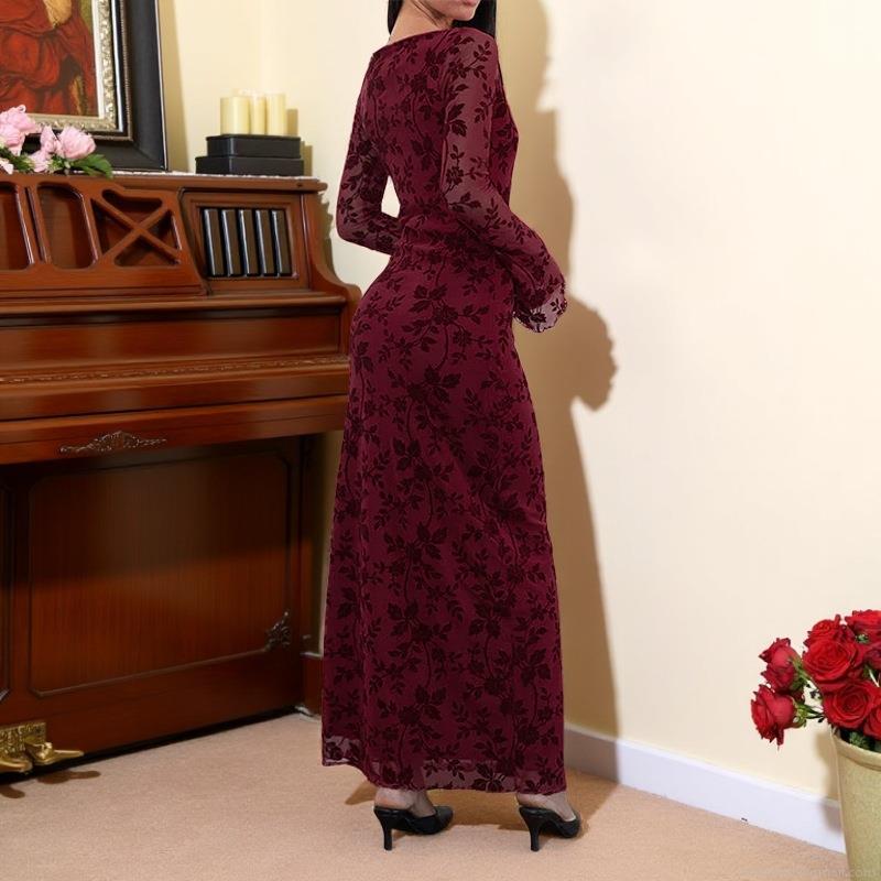• Women's Elegant High Neck Long Sleeve Floral Print Maxi Dress Sexy Backless Bodycon Flocking Mesh Evening Party Long Gown Night Out Dress