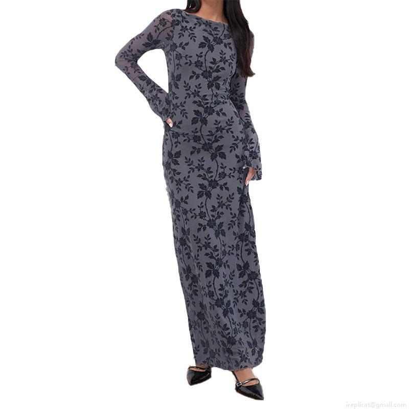 Women's Elegant High Neck Long Sleeve Floral Print Maxi Dress Sexy Backless Bodycon Flocking Mesh Evening Party Long Gown Night Out Dress