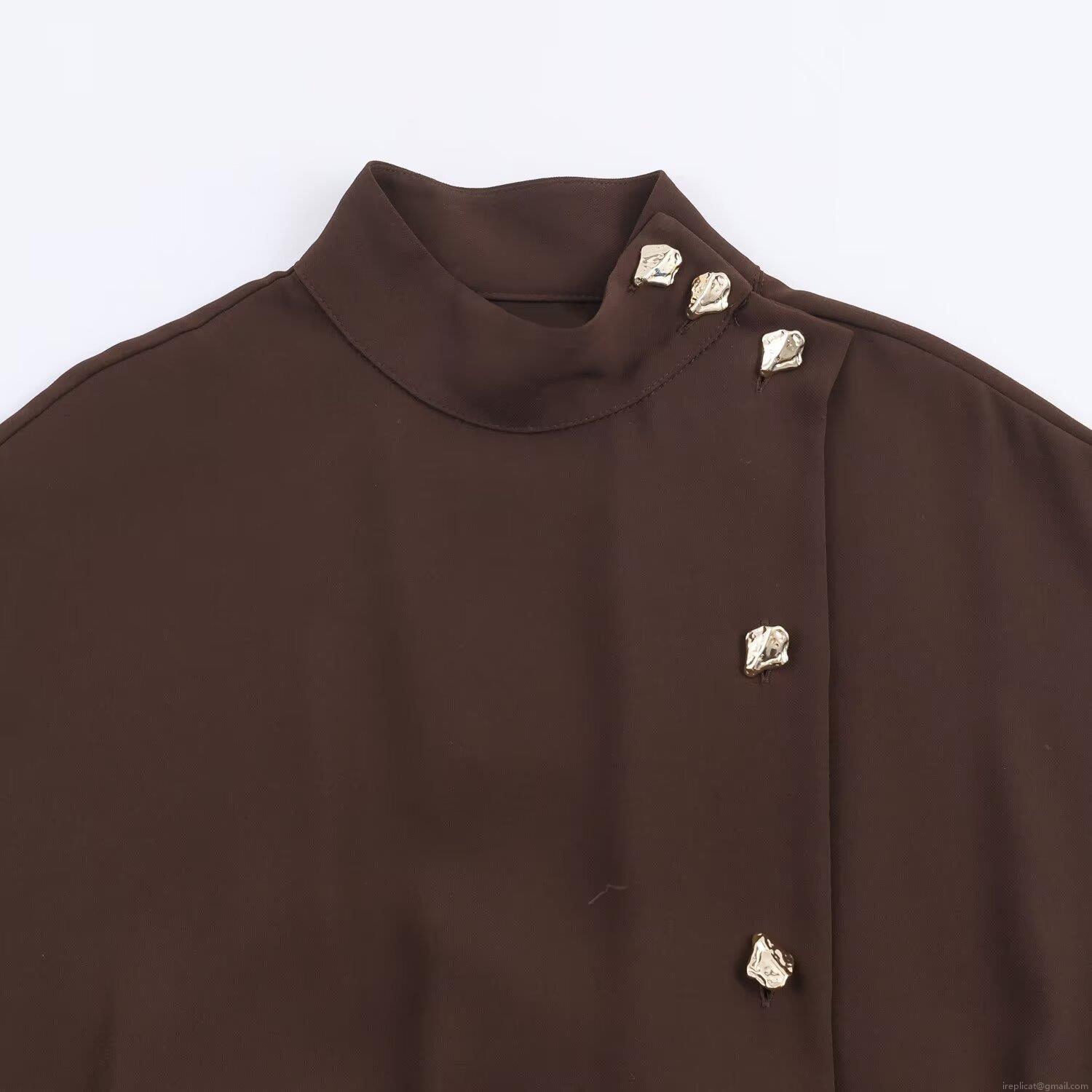 Solid Color, High Collar, Side Shoulder Irregular Metal Button, Crocodile-textured Belt, Side-slanted Placket Design