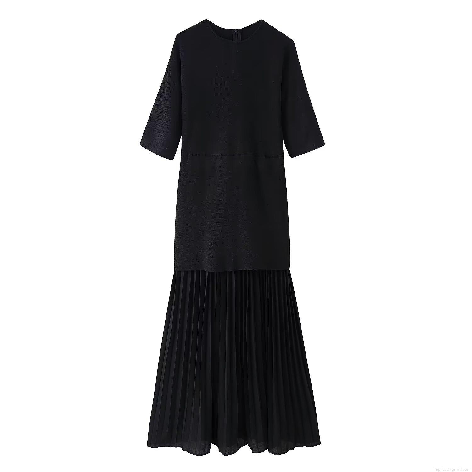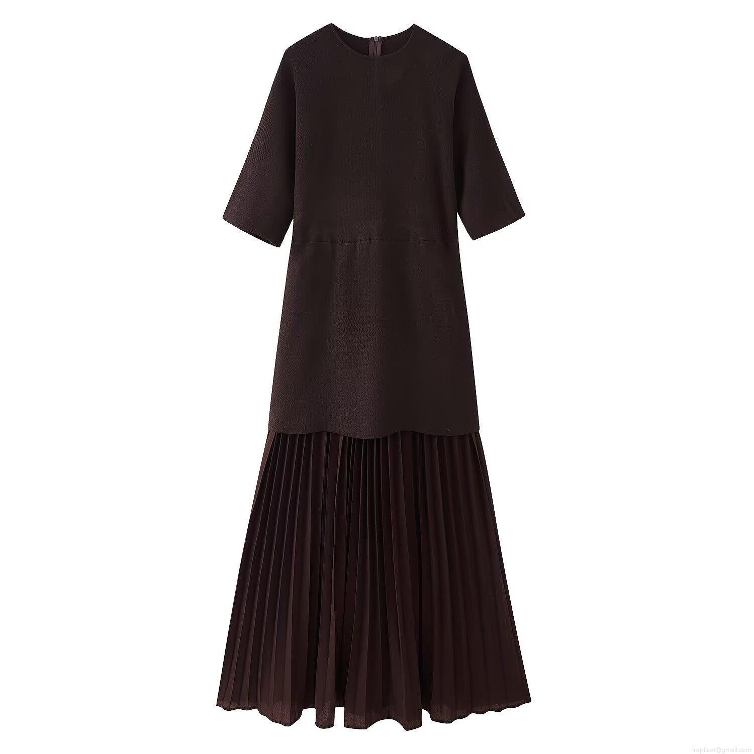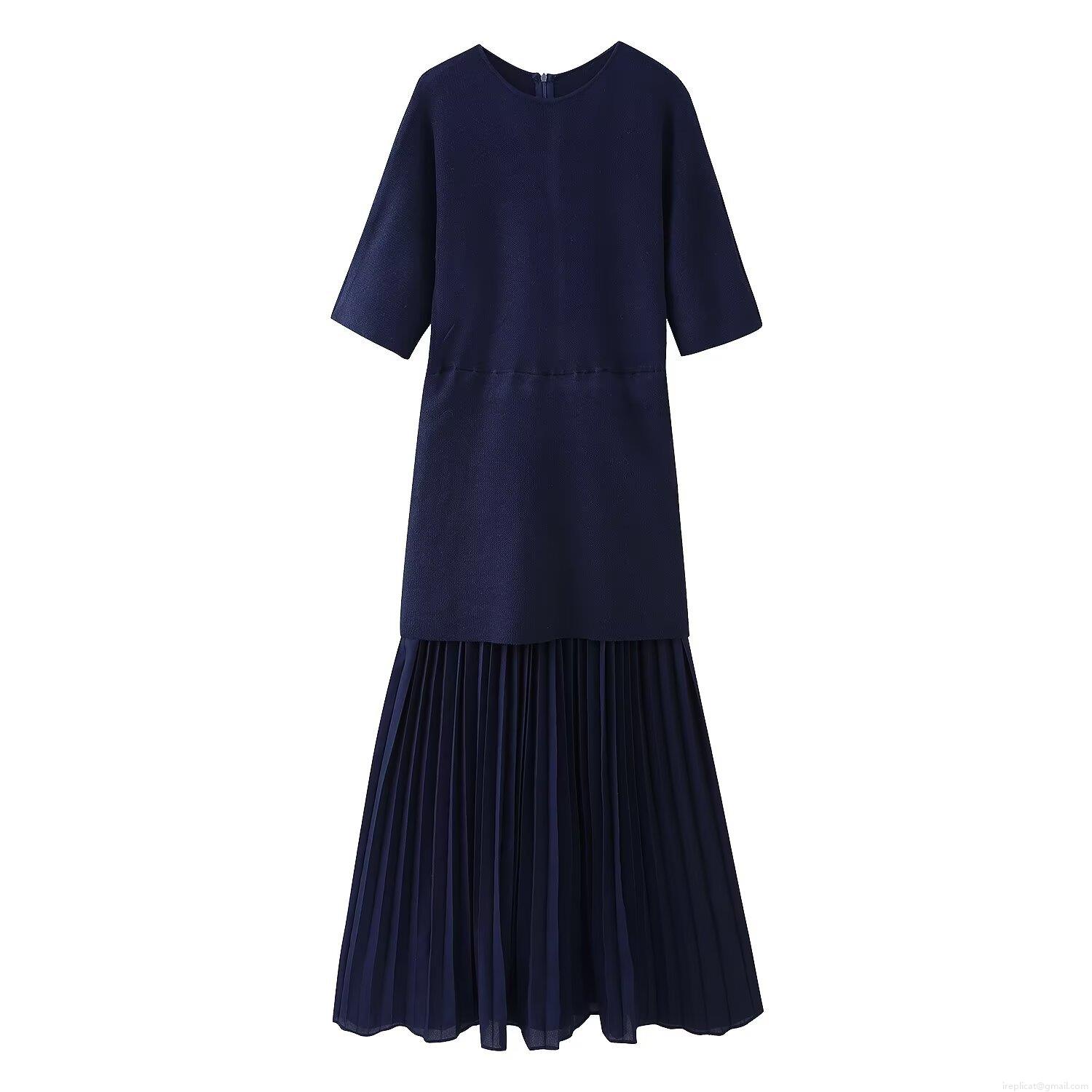 • Women's Elegant Knit Patchwork Pleated Maxi Dress Round Neck Short Sleeve Solid Color Slim Fit A-Line Casual Party Long Dress For Women