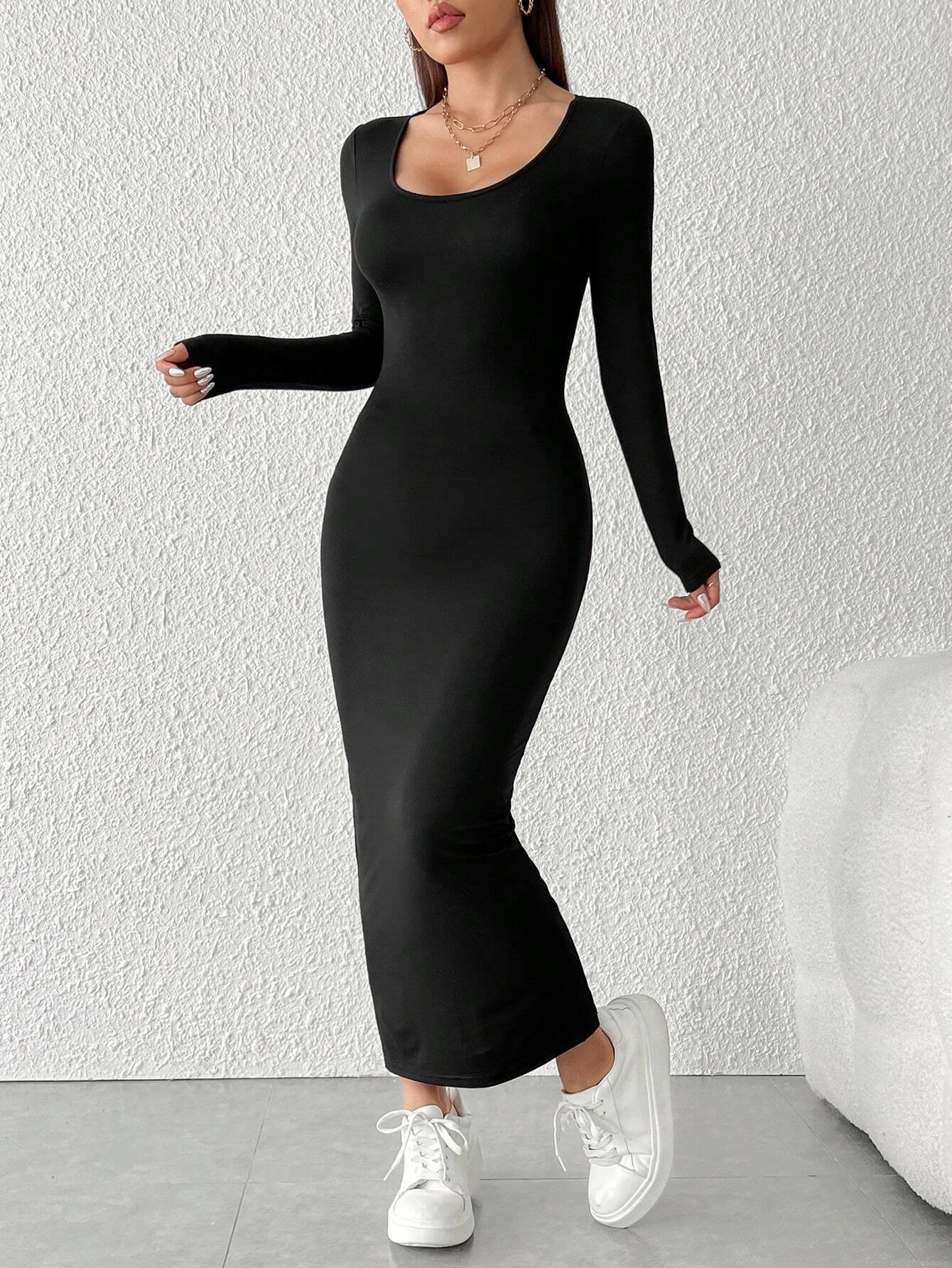 • Women's Elegant Knitted Bodycon Maxi Dress Long Sleeve U-Neck Solid Color Slim Fit Ankle Length Dress For Party Casual Ladies Autumn Winter Clothing