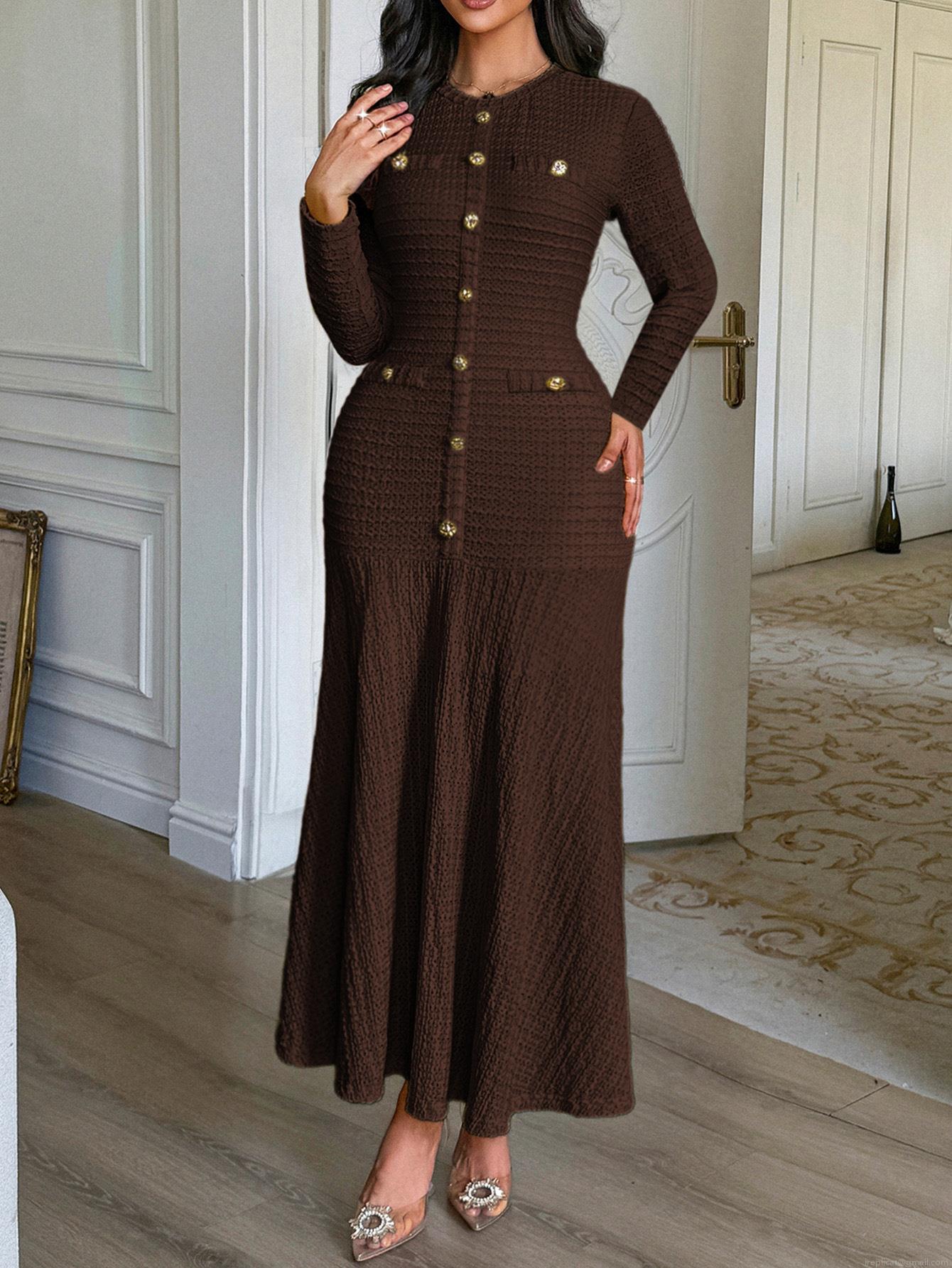 • Women's Elegant Knitted Maxi Dress Long Sleeve Round Neck Slim Fit Textured Polyester Spandex Gown with Gold Buttons for Party Office Work Wear