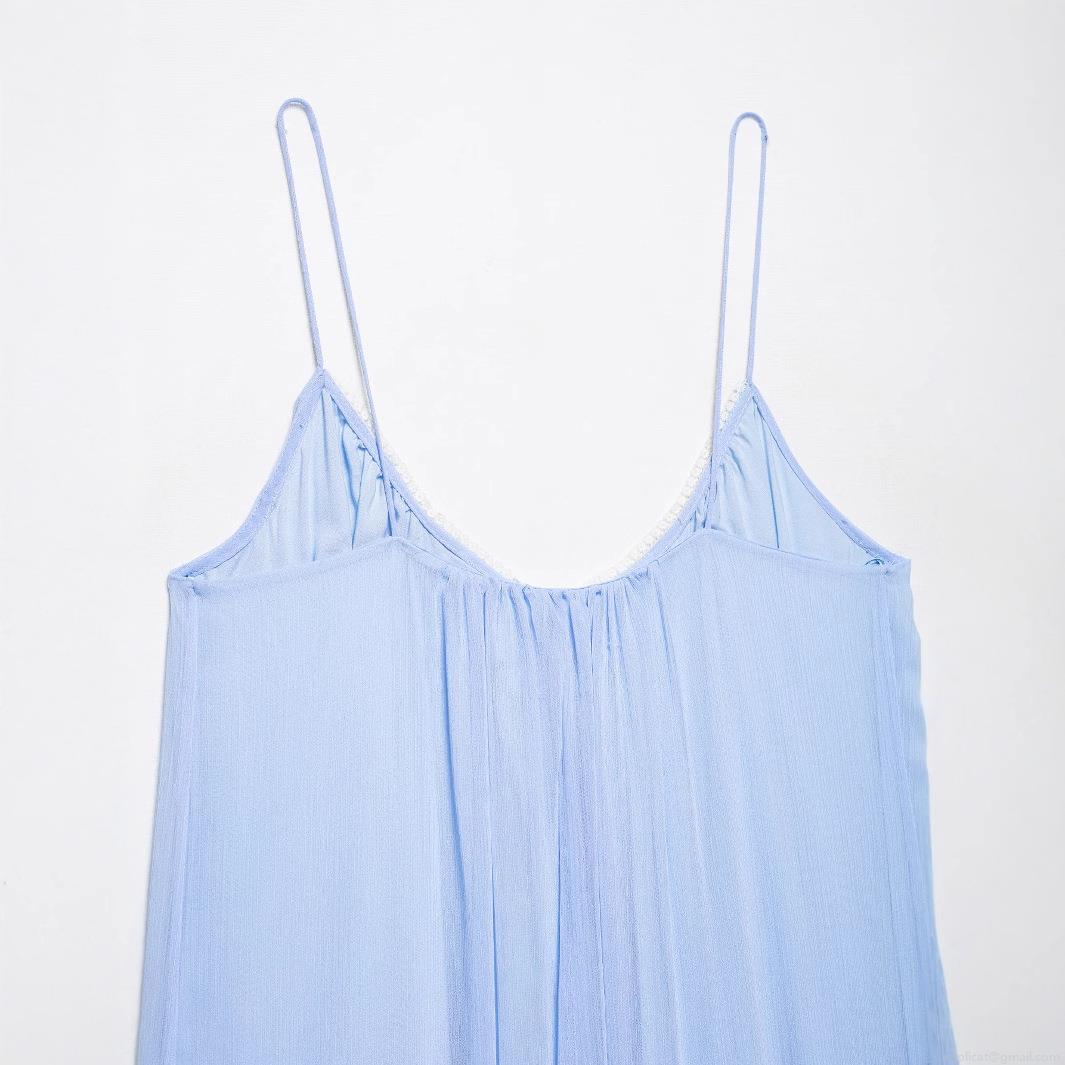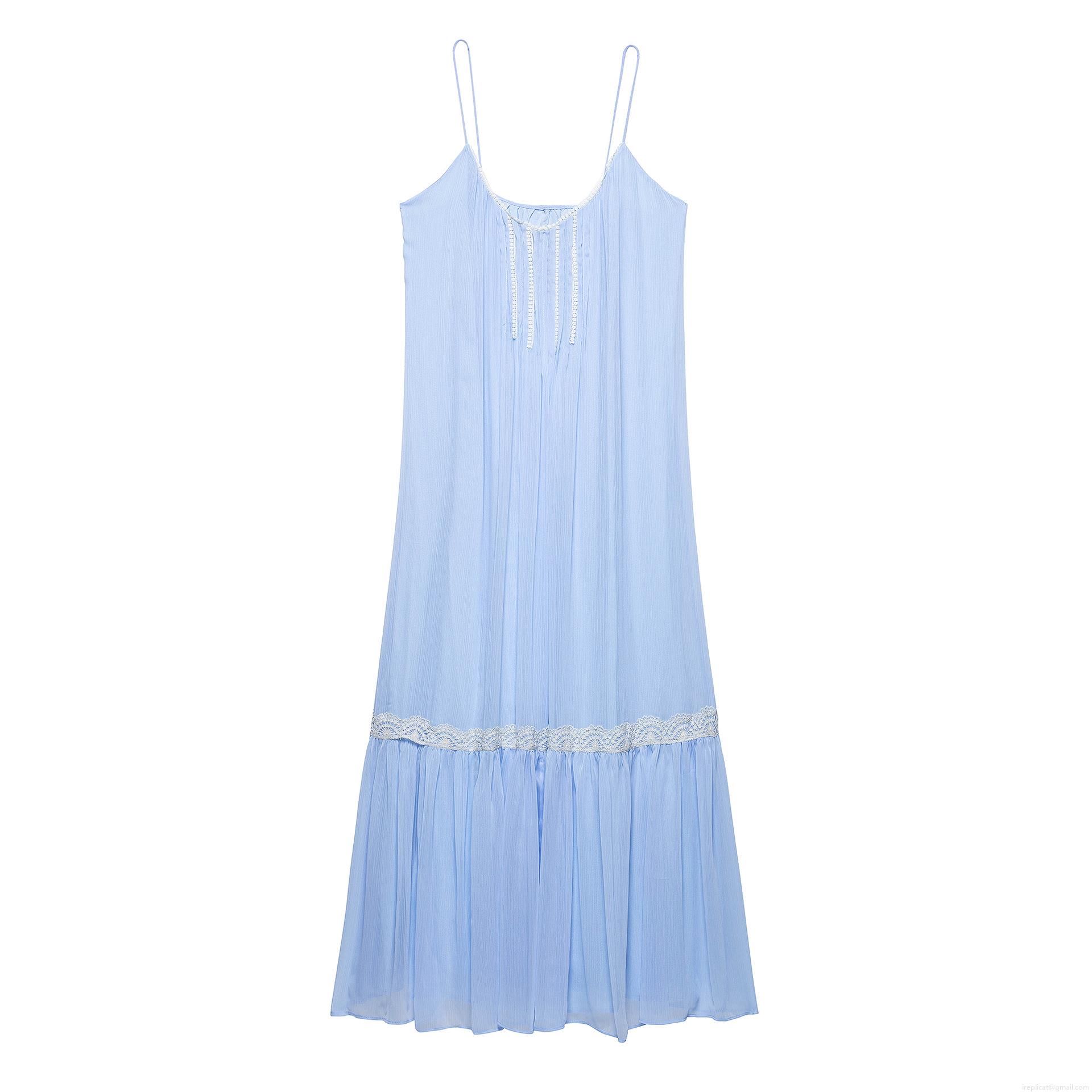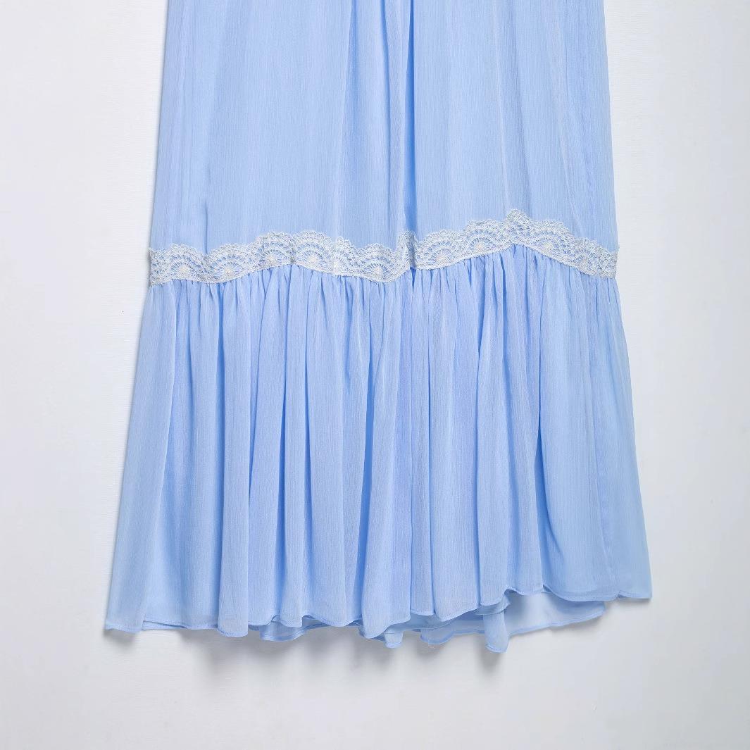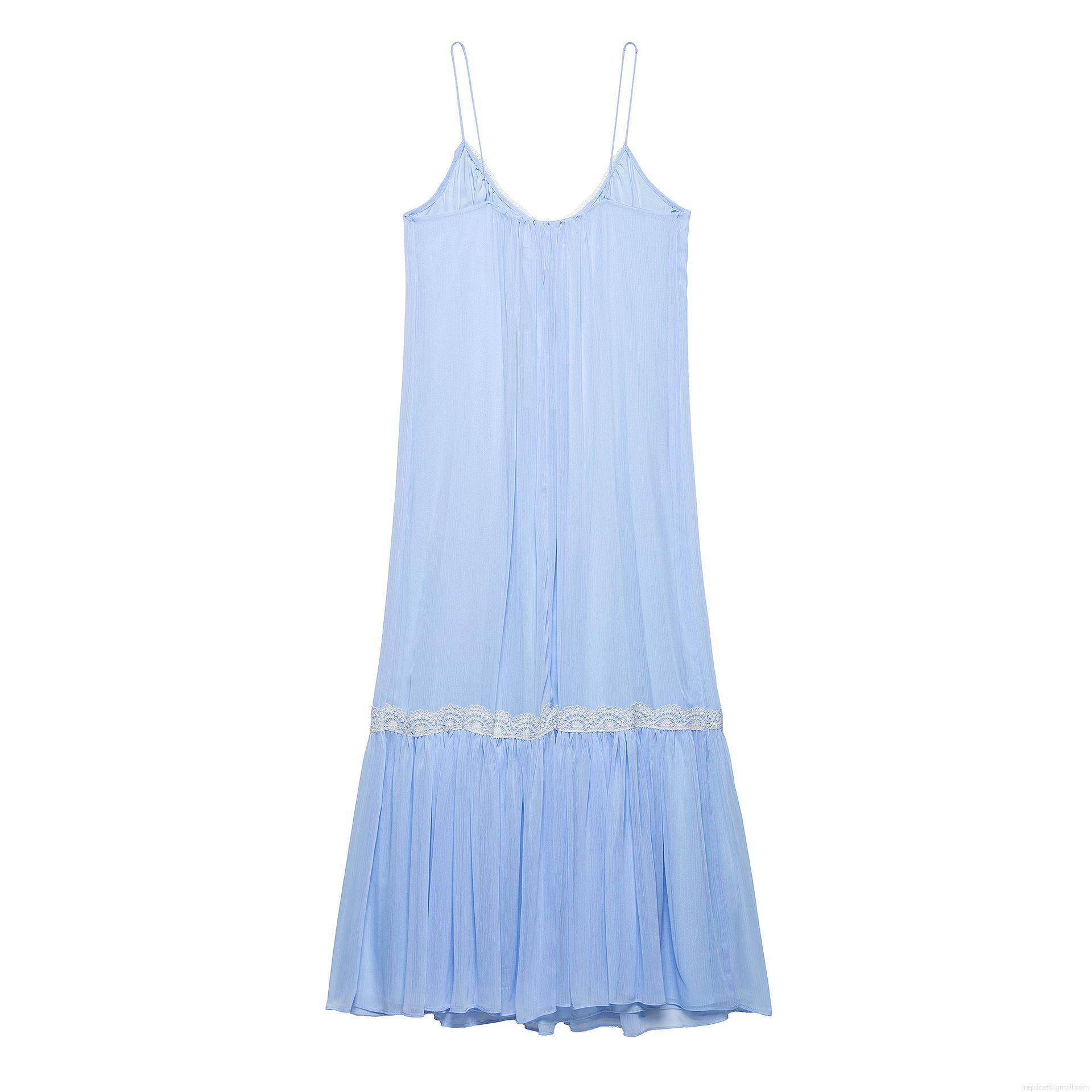 • Women's Elegant Light Blue Cami Maxi Dress With White Lace Trim V-Neck Pleated Backless Summer Vacation Polyester Long Dress