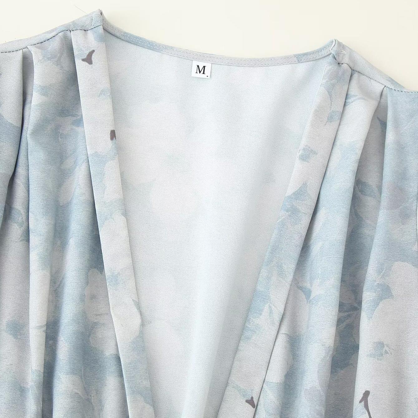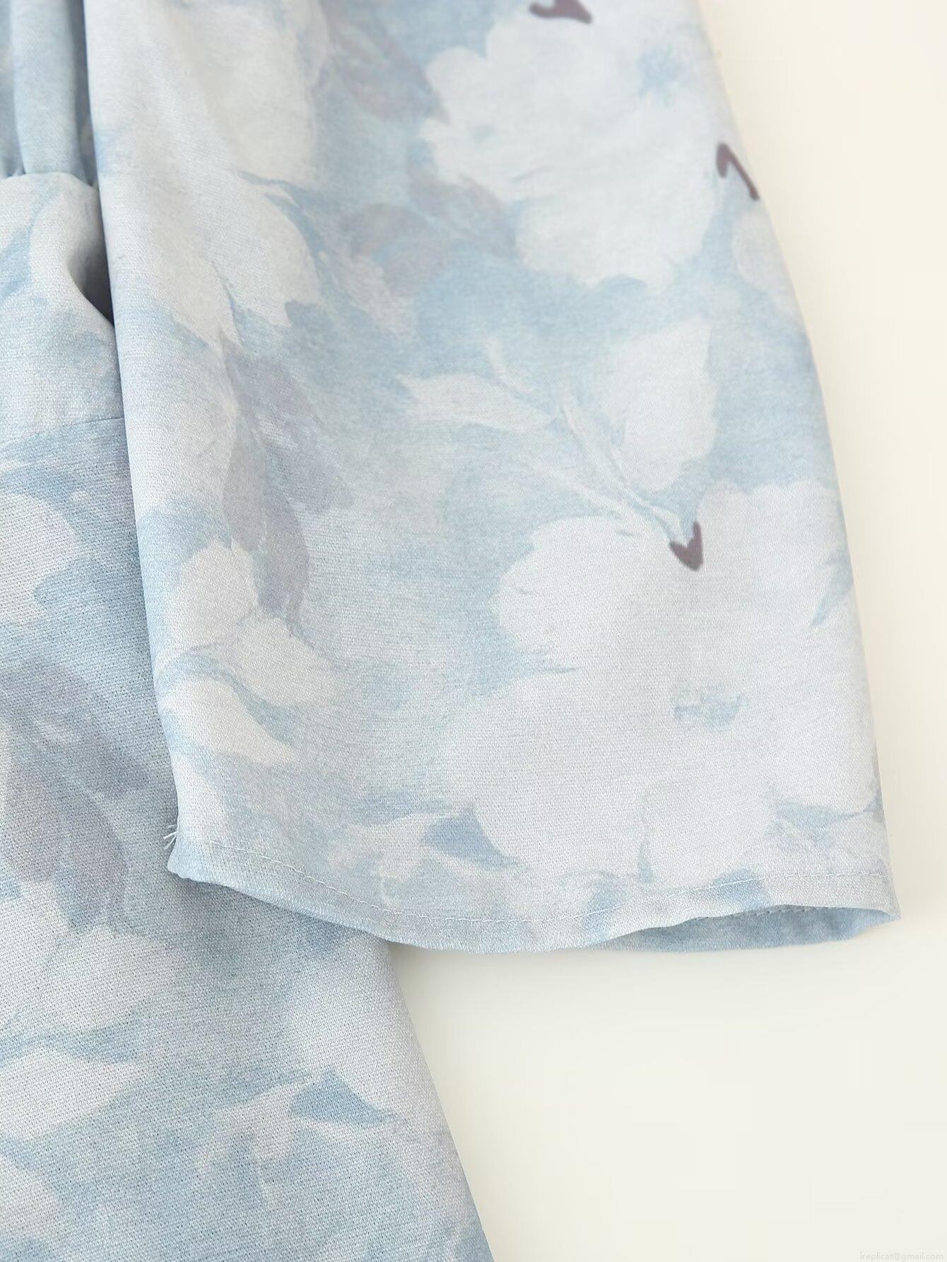 • Women's Elegant Light Blue Floral V-Neck Maxi Dress Puff Sleeve Pearl Button High Waist Pleated A-Line Lightweight Polyester Chiffon Summer Party Vacation Dress