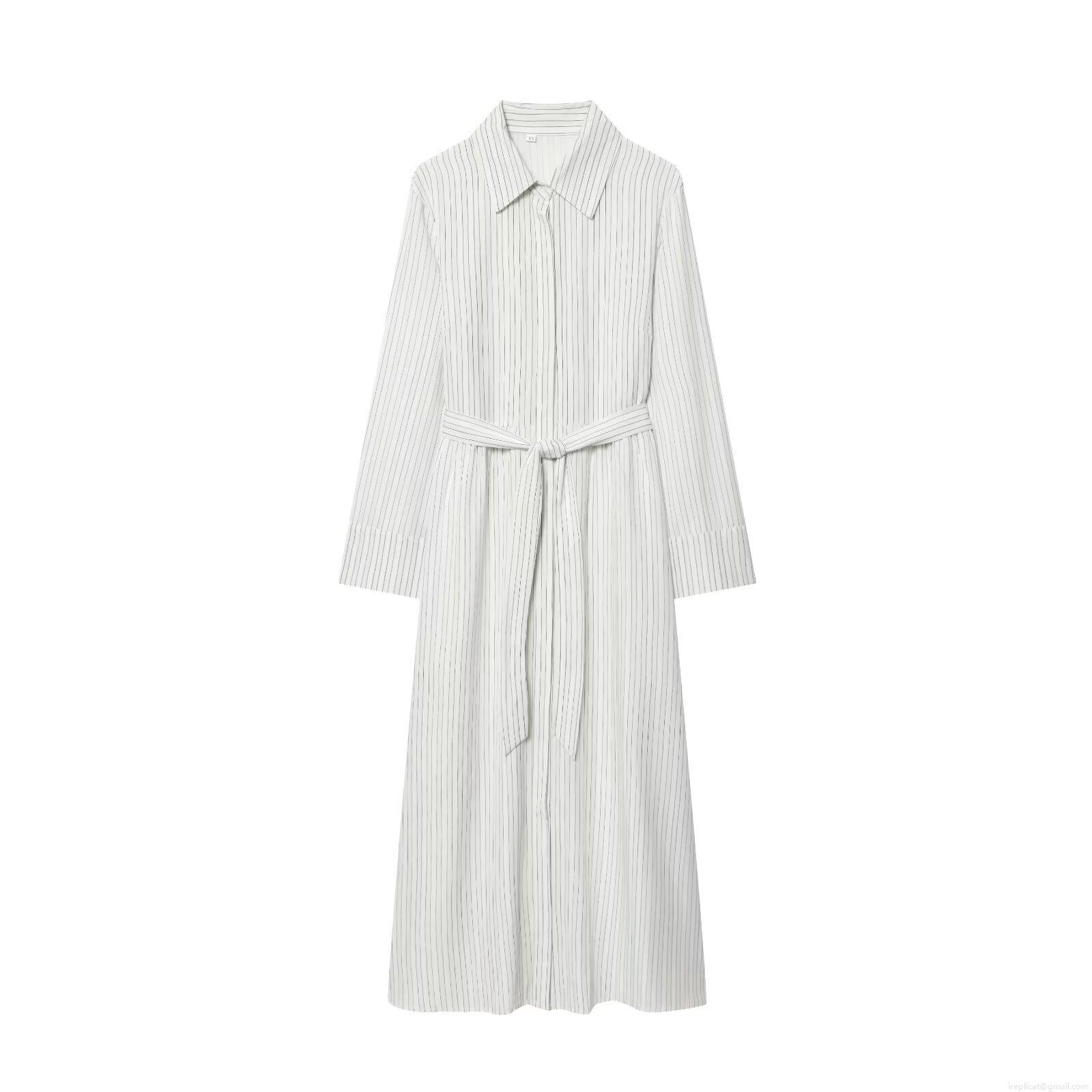 Women's Elegant Long Sleeve Maxi Shirt Dress with Waist Belt Button Down Solid White and Vertical Striped Pattern Casual Office Work Dresses