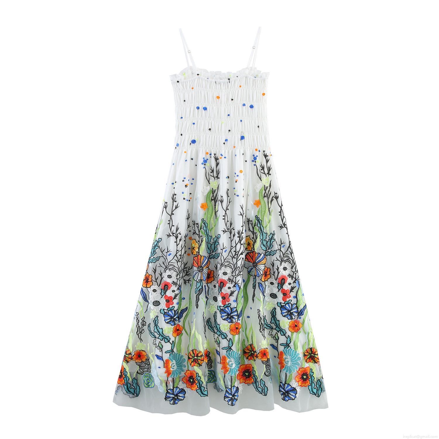 • Women's Elegant Mesh Tulle Maxi Dress Sweet Floral Embroidery Smocked Bodice Adjustable Cami Long Dress For Summer Vacation Beach Party Breathable Holiday Attire