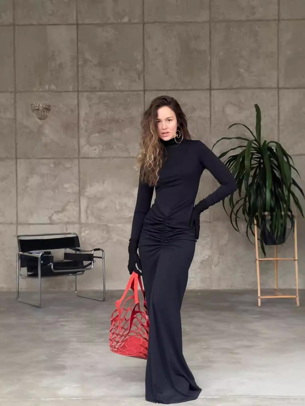 • Women's Elegant Mock Neck Long Sleeve Ruched Bodycon Maxi Dress Polyester Elastane Milk Silk Slim Fit Evening Party Streetwear Dress
