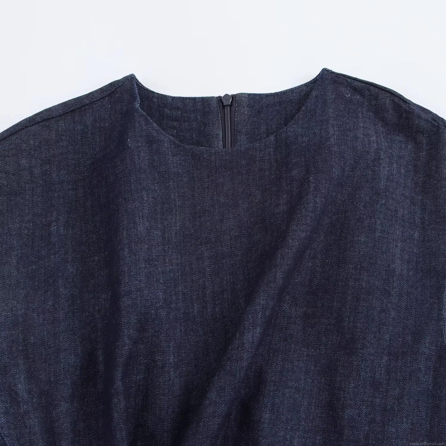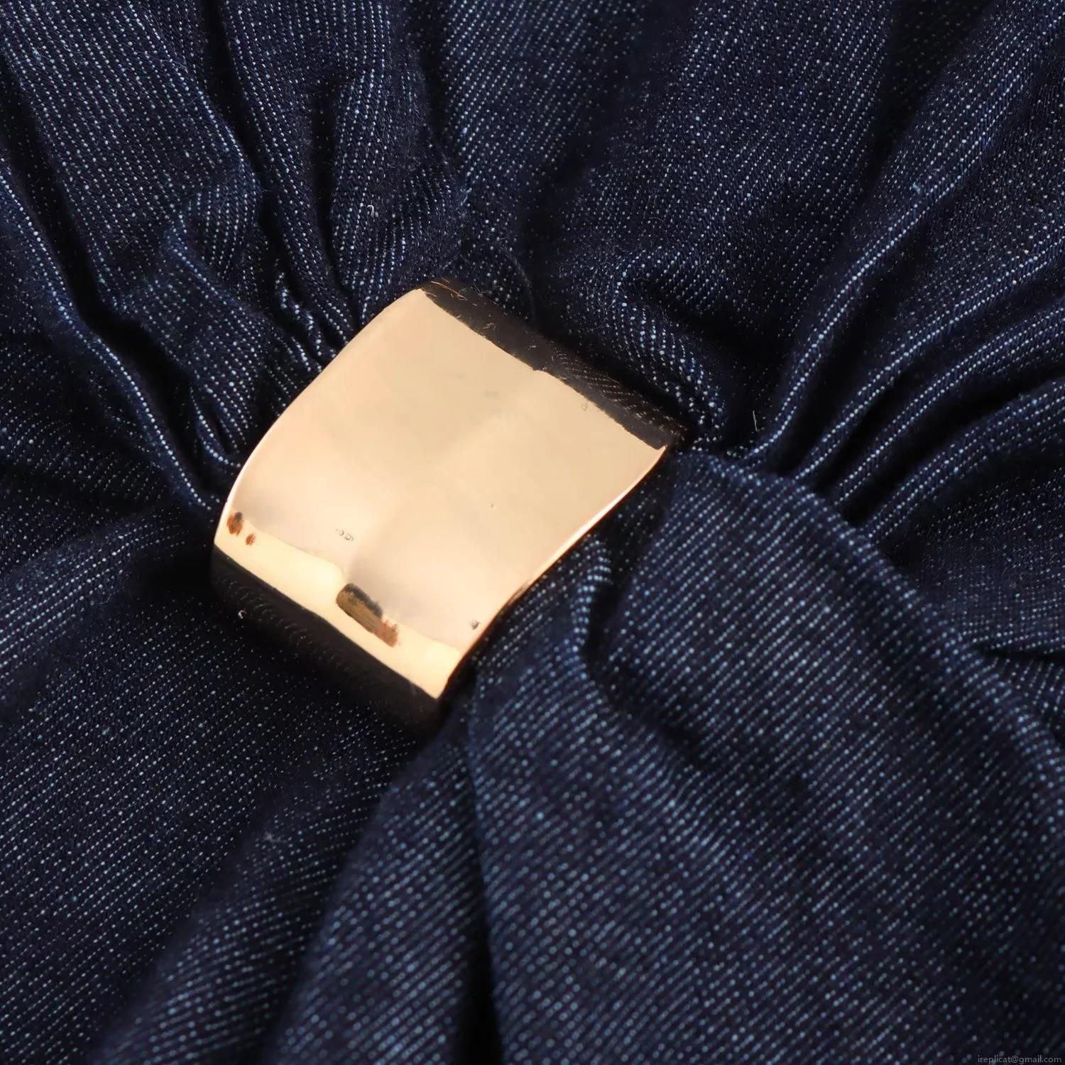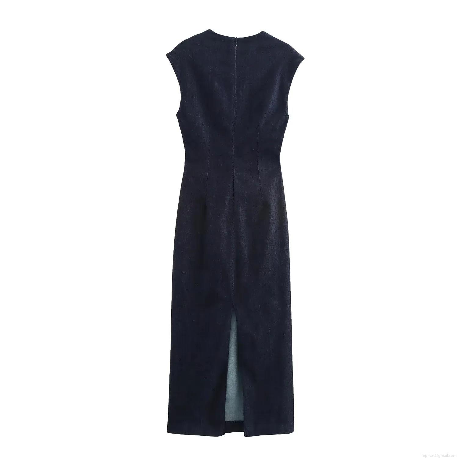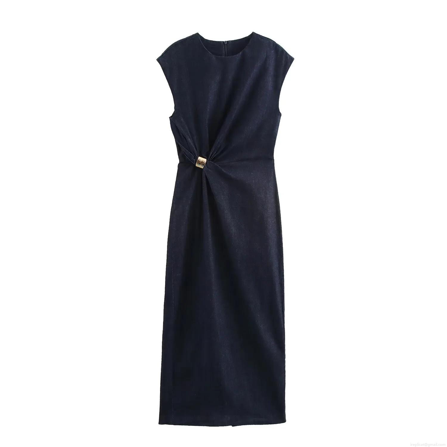• Women's Elegant Navy Blue Denim Texture Maxi Dress Sleeveless Round Neck Slit Hem With Gold Metal Ring Embellishment Slim Fit Party Evening Long Dress