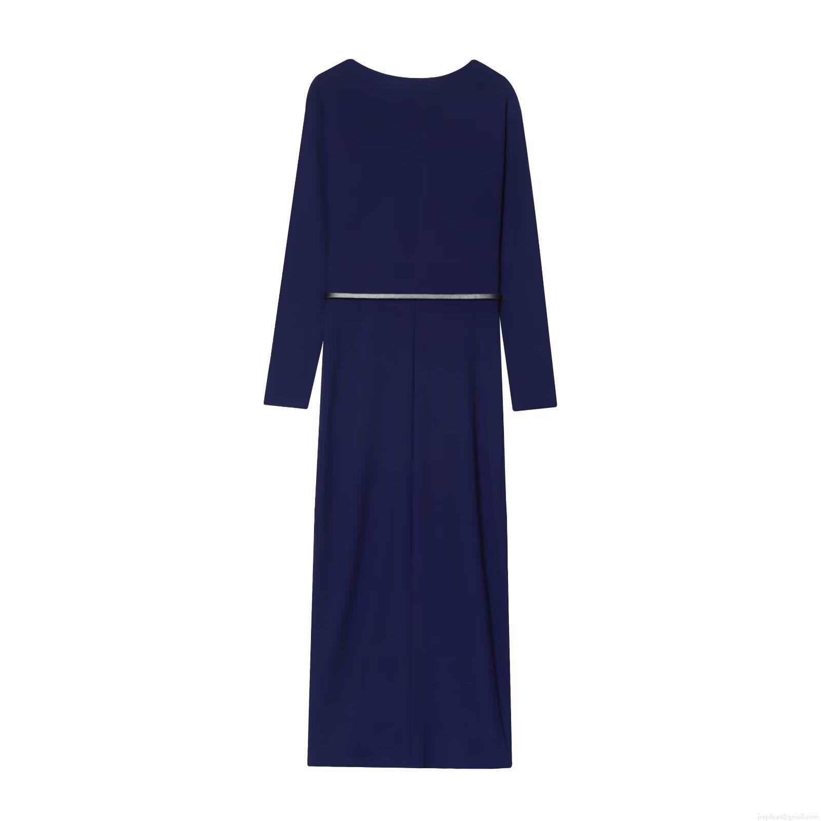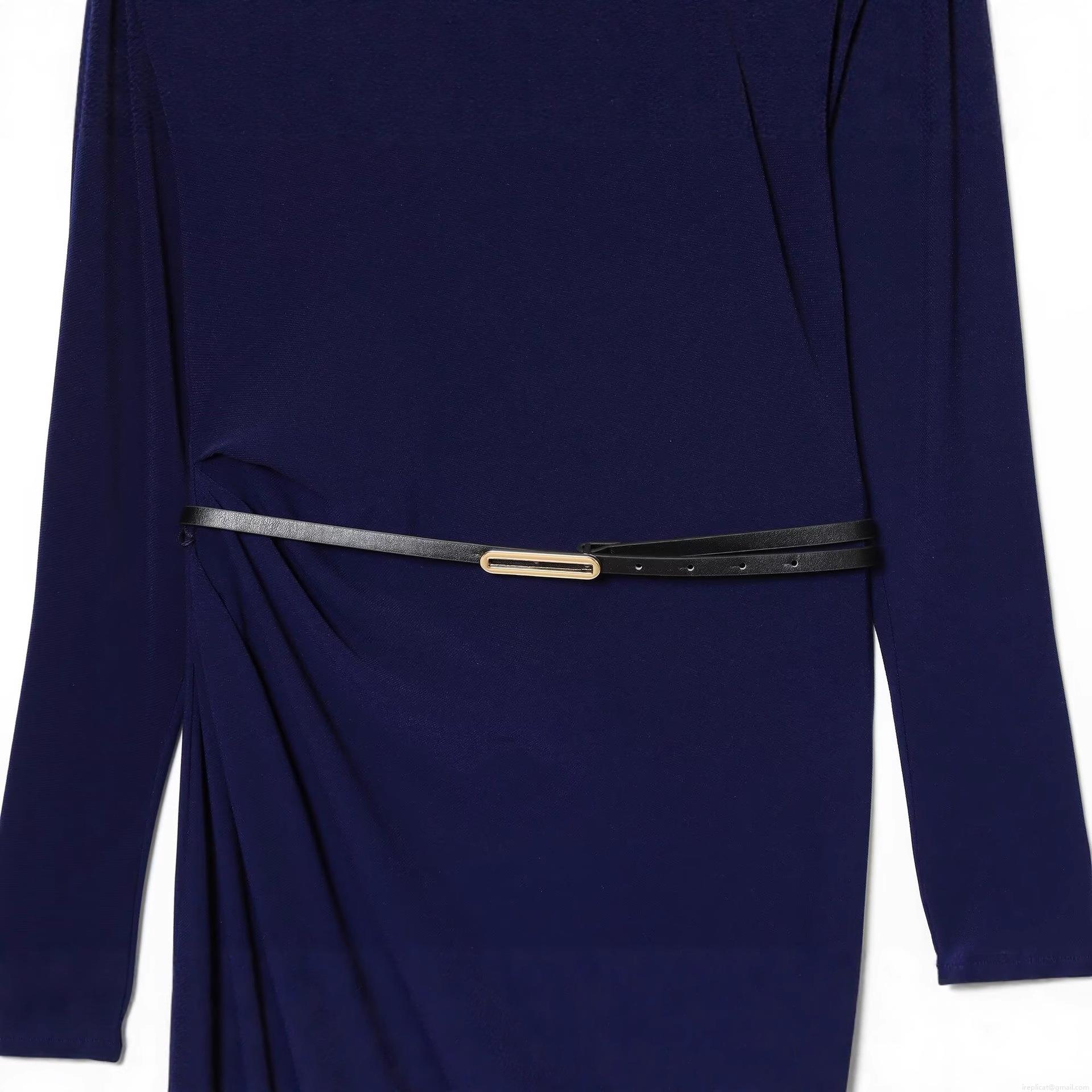 • Women's Elegant Navy Blue Maxi Dress Asymmetrical Ruched Neckline Long Sleeve Bodycon Gown With Belt Slim Fit Socialite Party Clothing