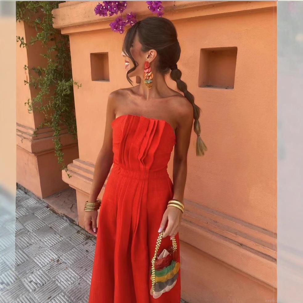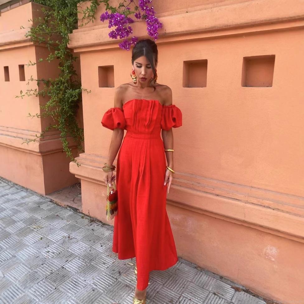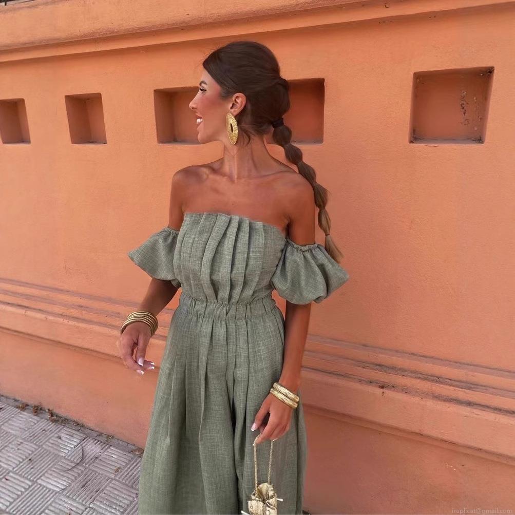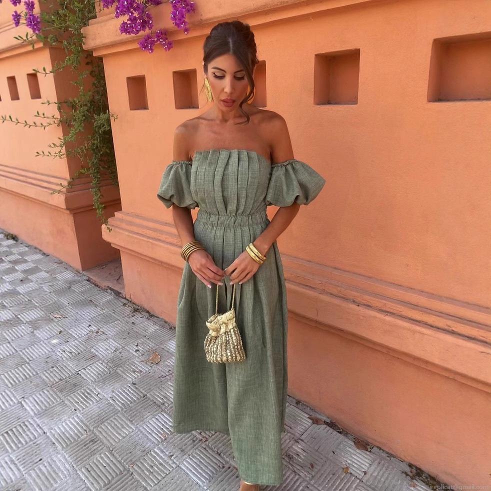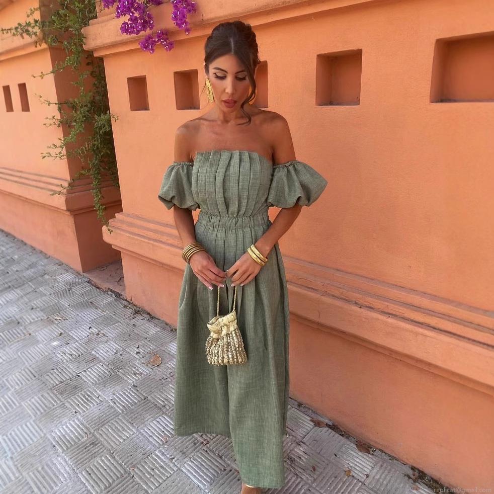 • Women's Elegant Off Shoulder Ruched Maxi Dress Sexy Puff Sleeve Backless Bandeau Dress Vacation Beach Party Polyester Linen Texture Dress