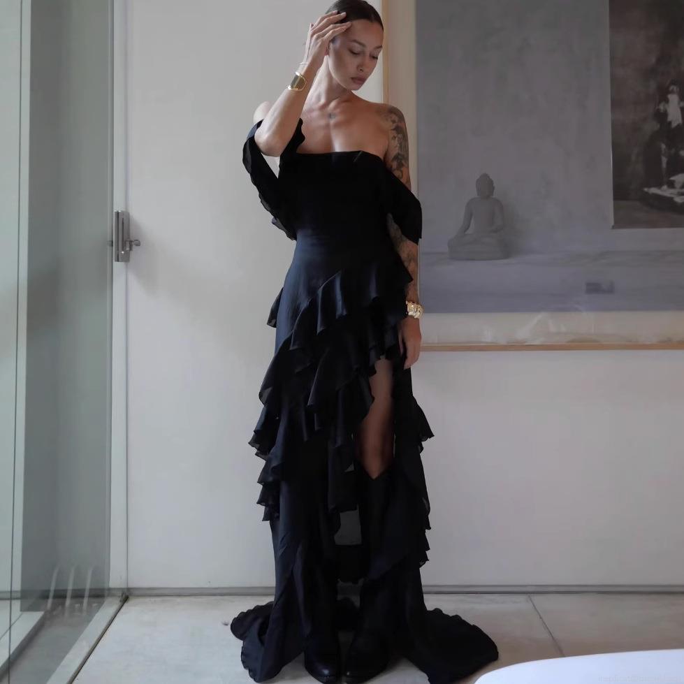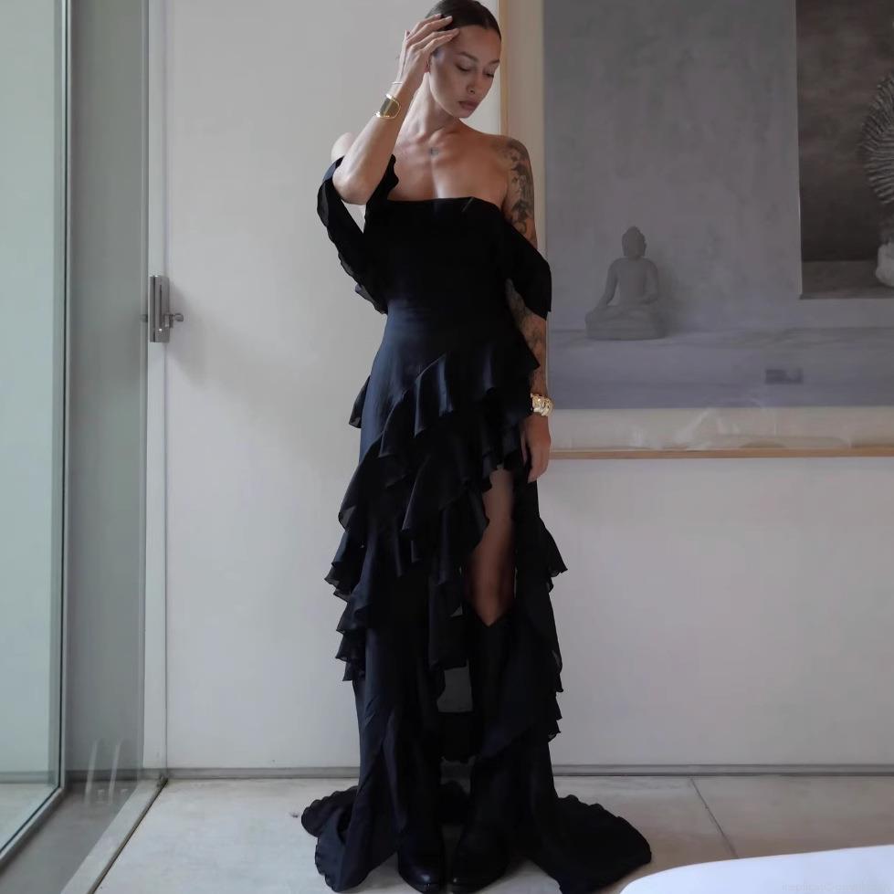 Solid Color, Pleats, Ruffles, Off-shoulder, Irregular Hem