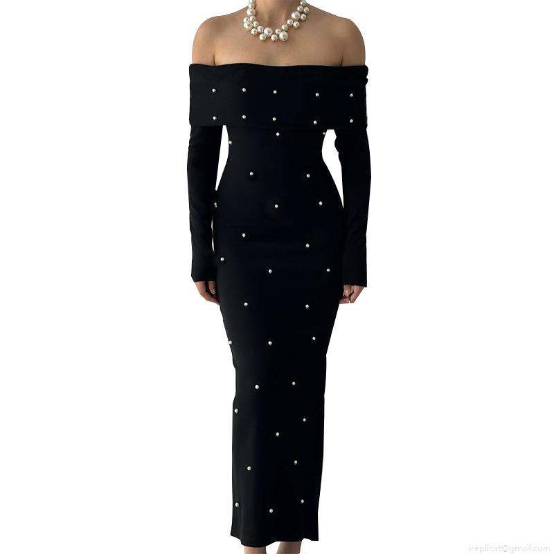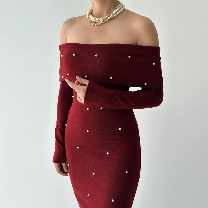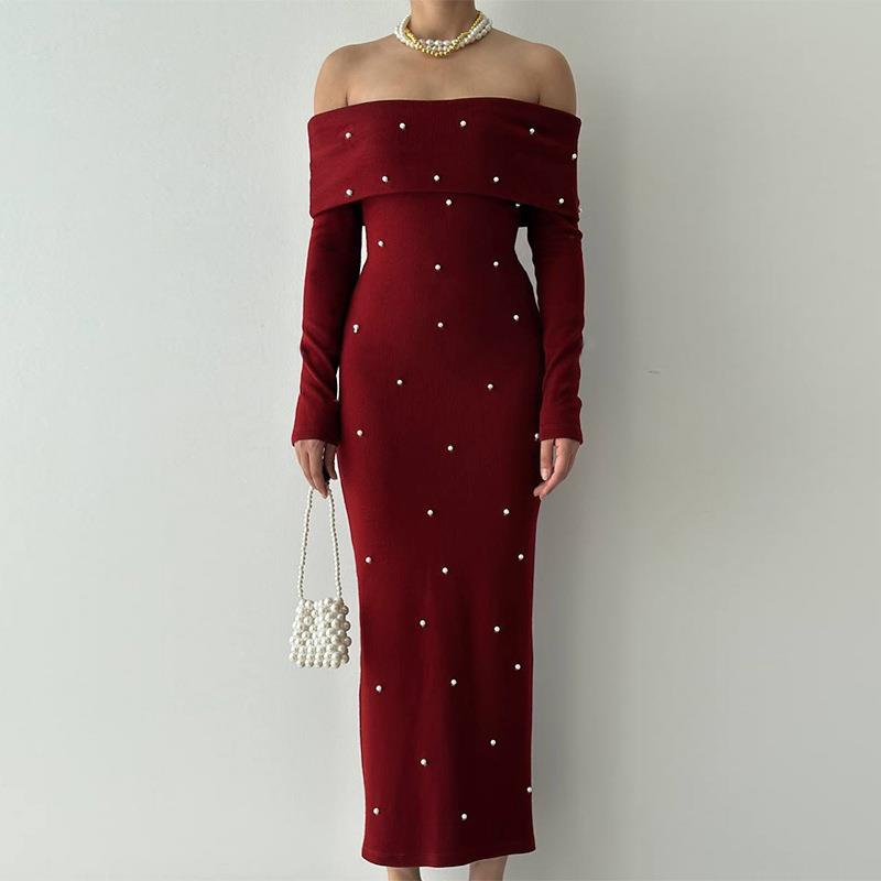 • Women's Elegant Off-Shoulder Knit Maxi Dress With Pearl Decoration Long Sleeve Bodycon Party Evening Dress For Ladies Sexy Slim Fit Knitted Gown